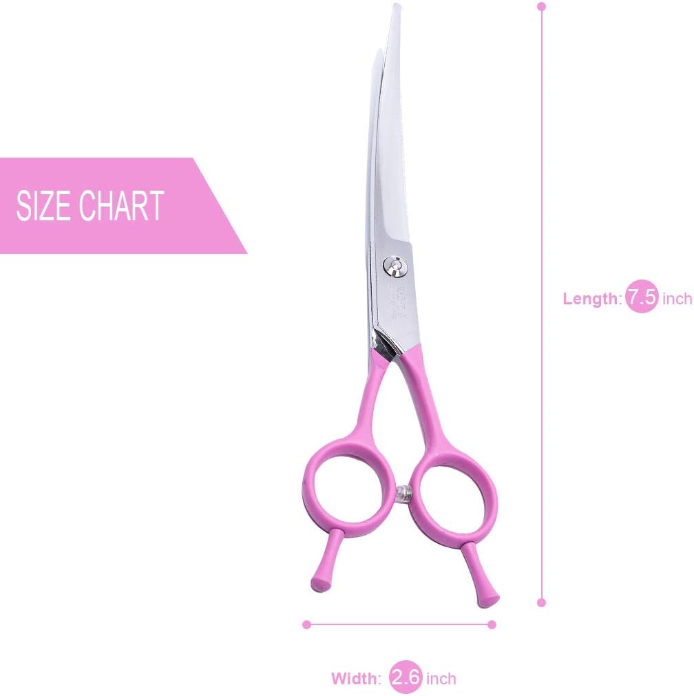 • THE SHARP STAINLESS MATERIAL CAN BE SUITABLE FOR DOGS WITH VARIOUS HAIR QUALITIES: We use stainless metal material with high stability, because this material is sharp enough and cost-effective, It is high-quality pet scissors for home pet grooming and novice groomers learning.