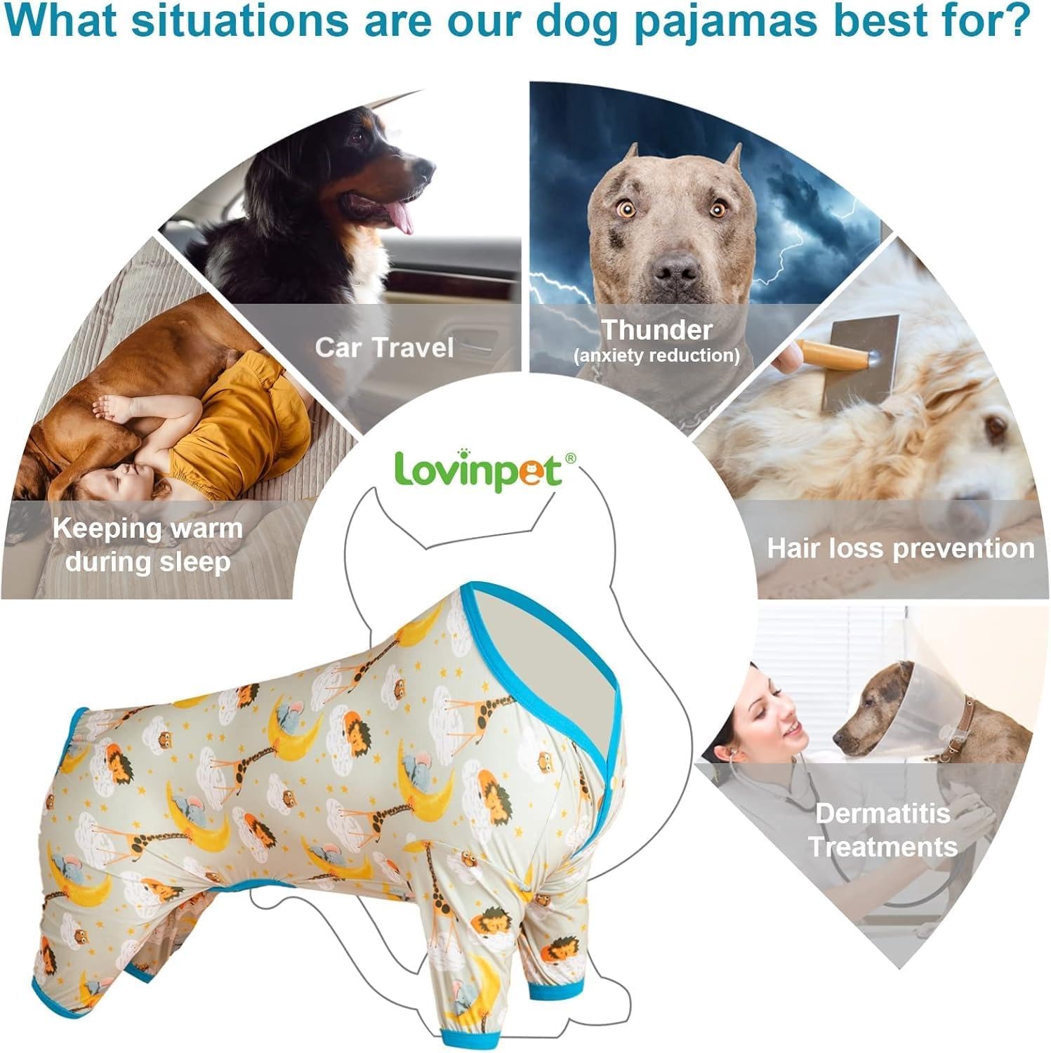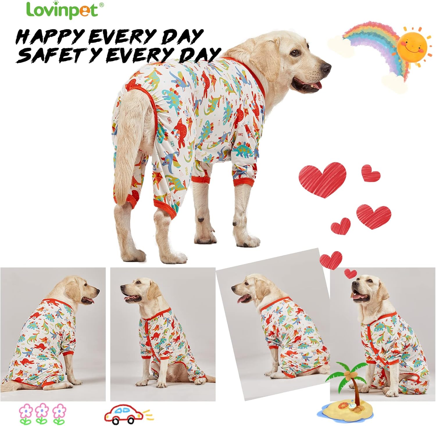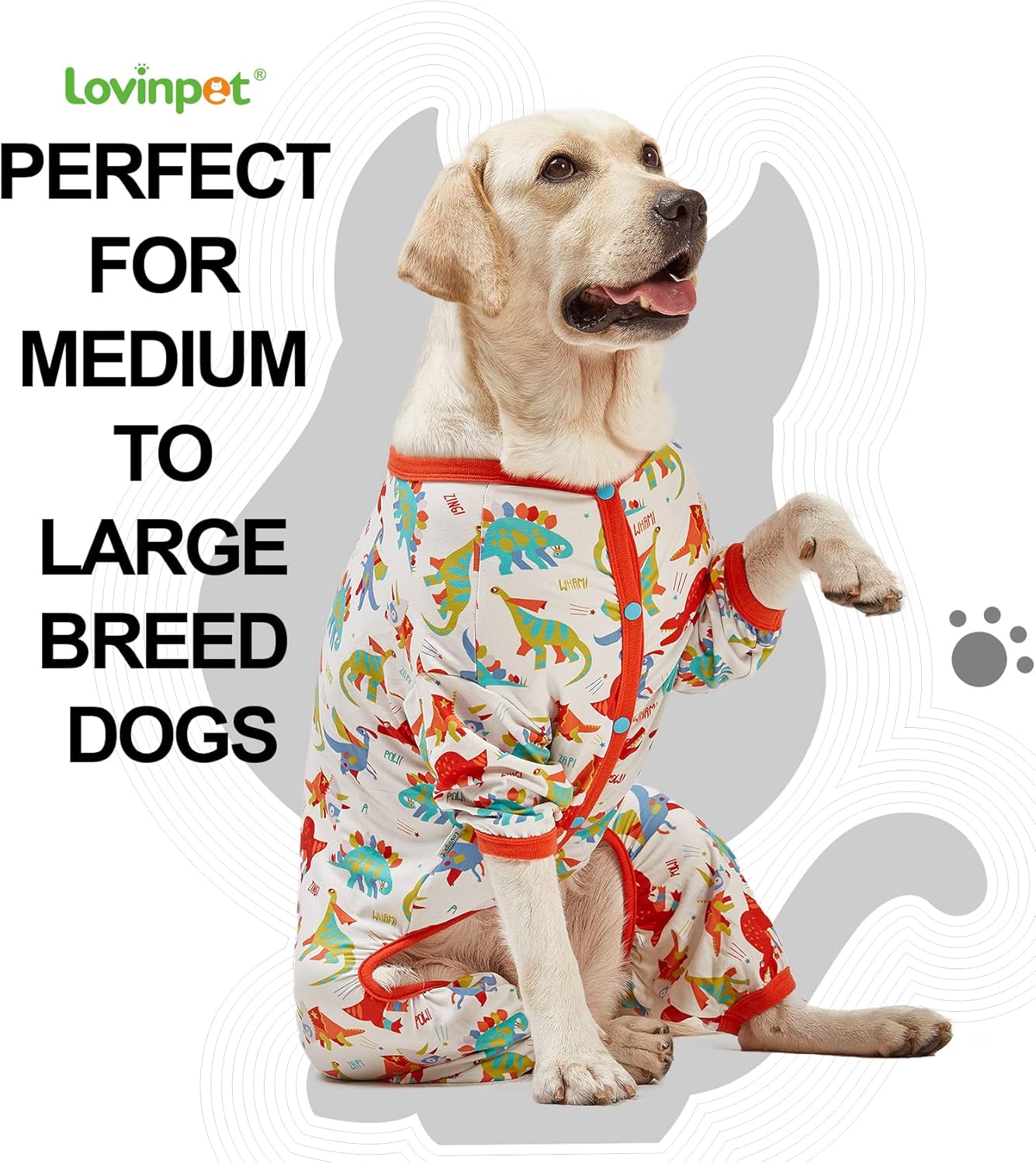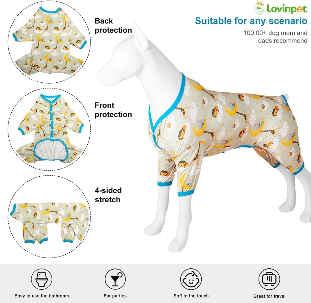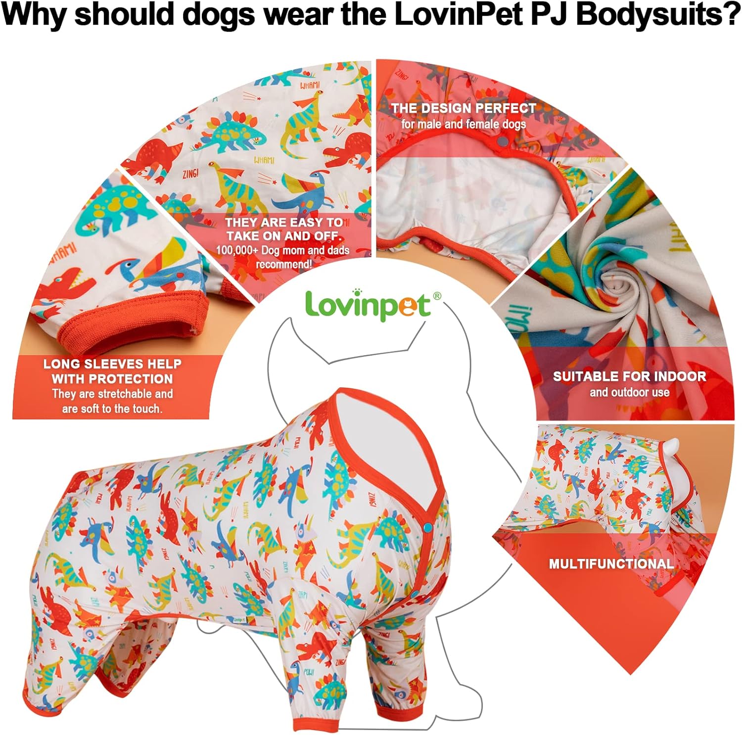 LovinPet Large Dog Pajamas, Undershirt for Dog Coats, Anti Licking, Pitbull Clothes, Pet Anxiety Calming Onesies for Dogs, White Dinos Print, Pet Pajamas for Dogs, Pitbull Shirt, 3XL
