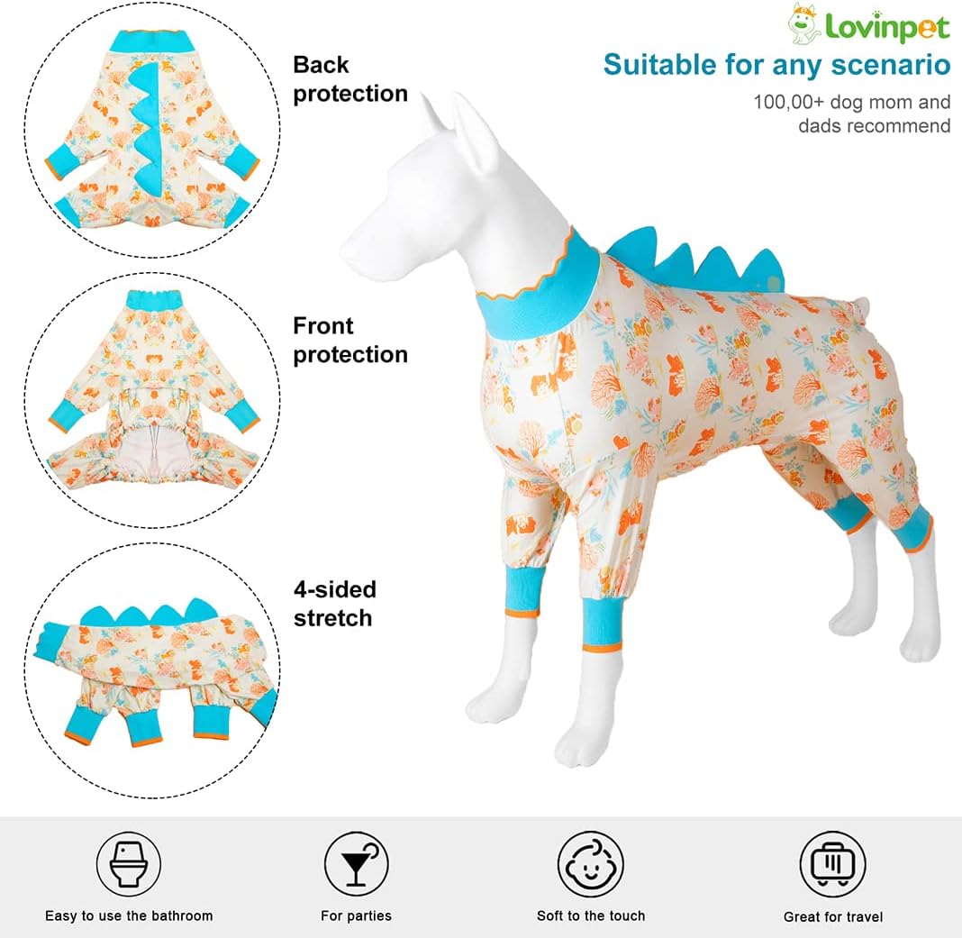 • [Innovative Design Protection] Dinosaur Decoration Crew Neck Design: This baby onesies for dogs with coral peach prints design. The collar adopts a lovely petal design, and the four-leg cuffs are designed with micro-puff sleeves. Very suitable for dogs as pjs or party wear. Without a doubt, your Dog will definitely become the most eye-catching one.