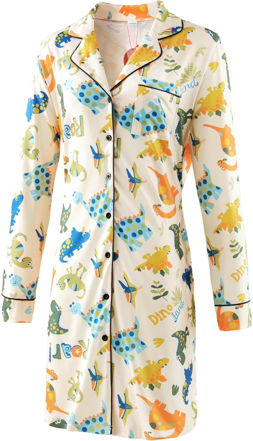LovinPet Dinosaur Print Button Front Sleepshirt Nightgown for Women, Long Sleeve Boyfriend Pajama Dress with 3 Pockets
