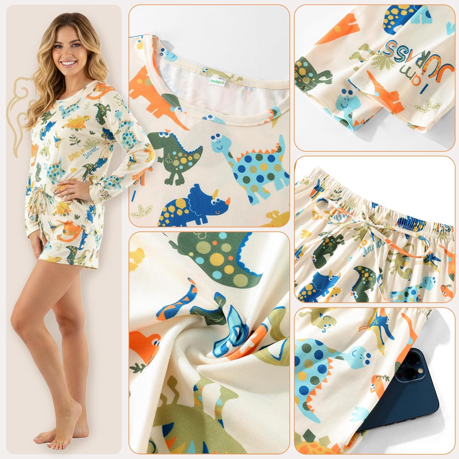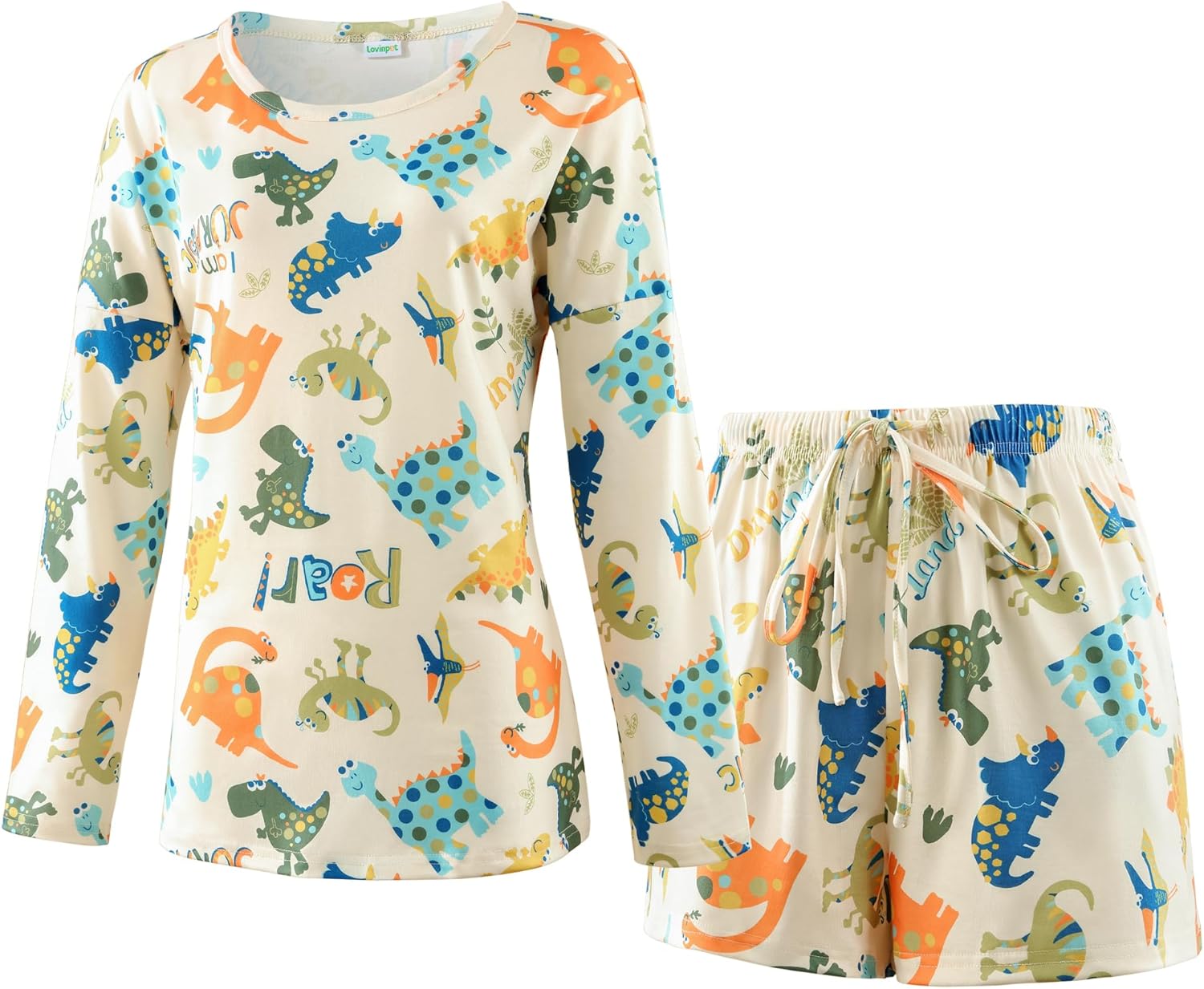 LovinPet Pajamas for Women Set, Womens Pajama Set with Pockets, Dinosaur Print Long Sleeve Top and Shorts