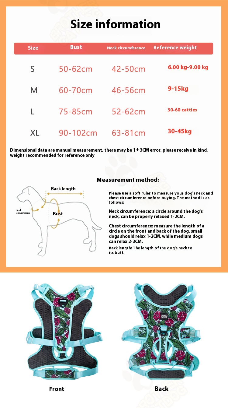 XL: chest circumference 90-102cm scarf 63-81cm recommended 30.00 kg-45.00 kg