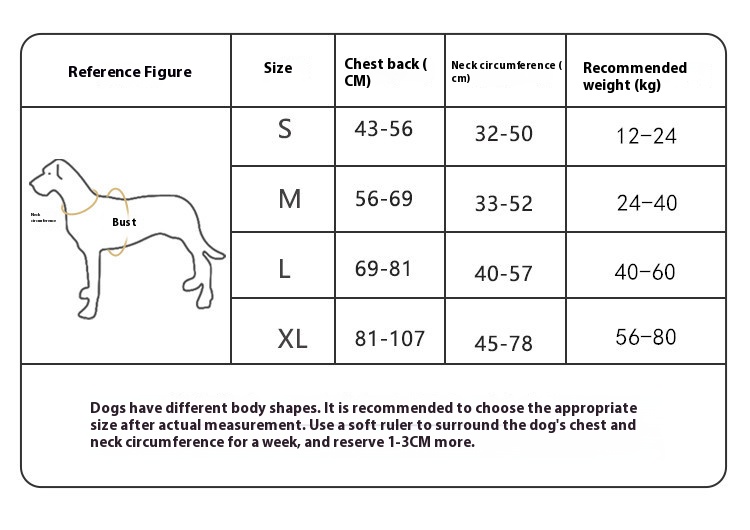 XL: chest circumference 81-107cm scarf 45-78cm recommended 28.00 kg-40.00 kg