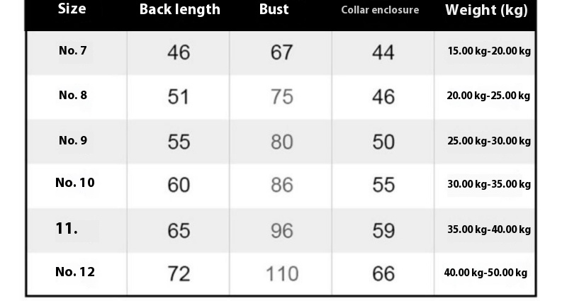 No.11: chest circumference about 96cm (32.50 kg-40.00 kg
