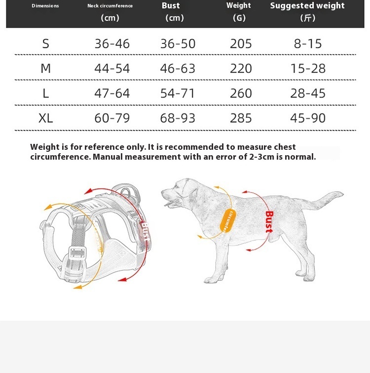 XL-chest circumference: 68-93cm reference weight: 22.50 kg-45.00 kg