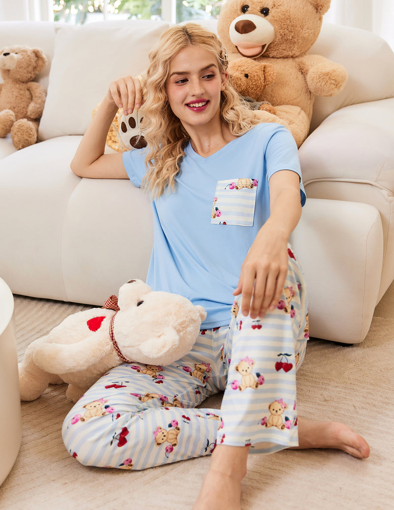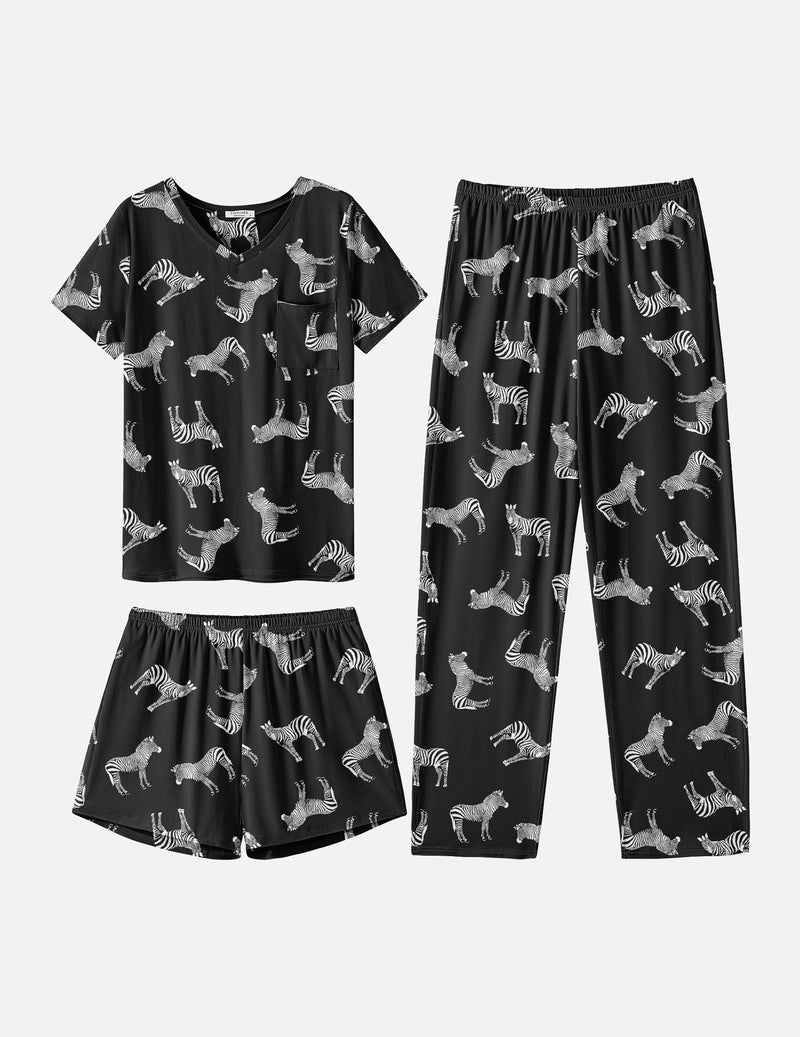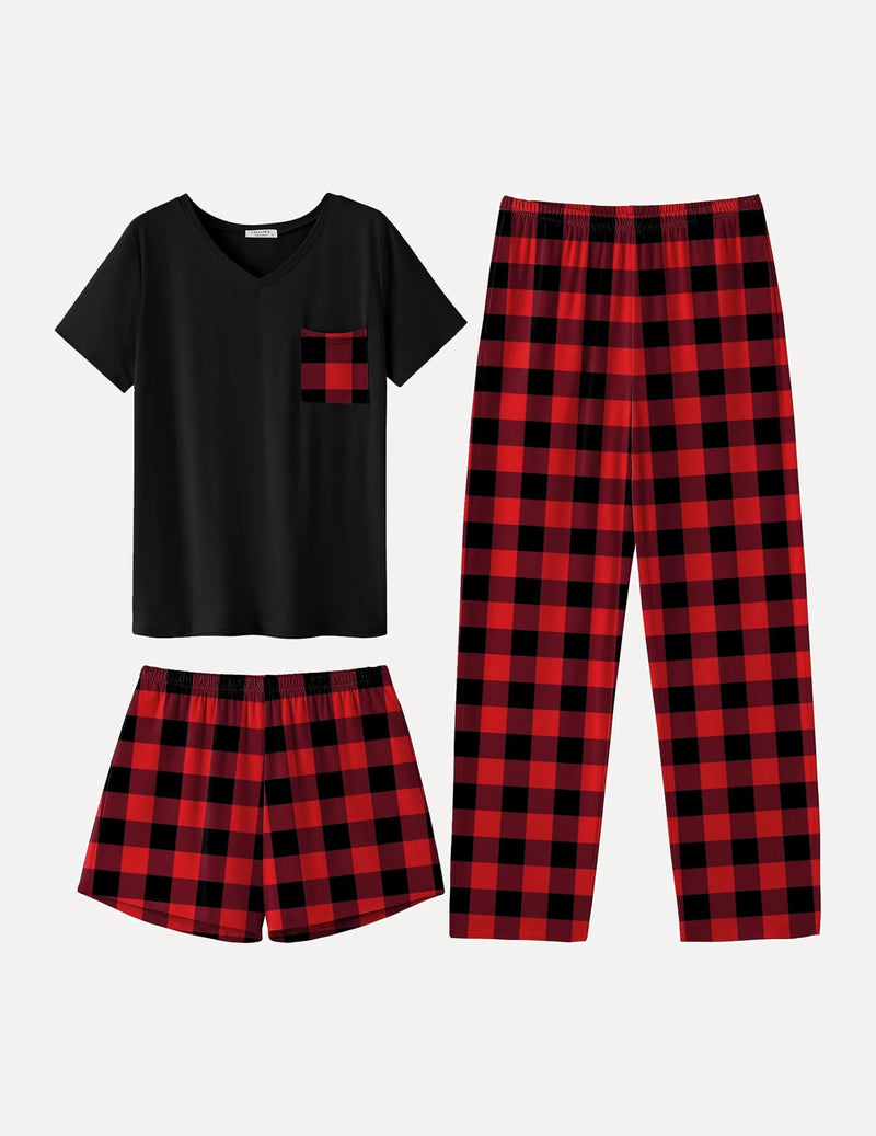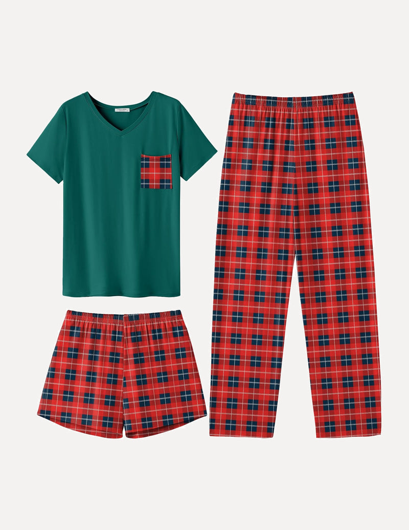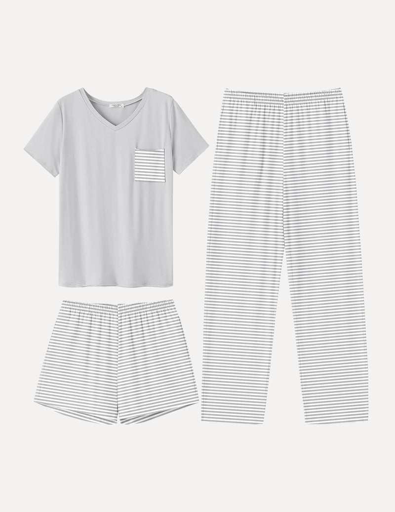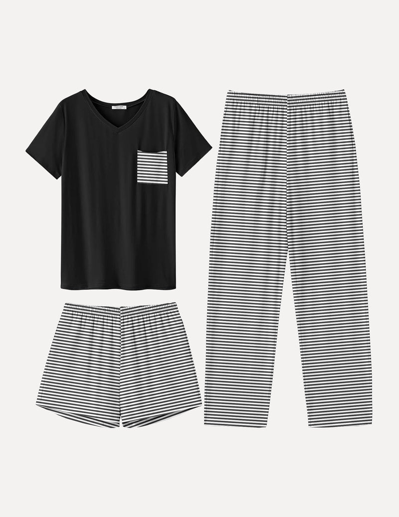 • Comfort & Versatility: 3 piece pajama set includes a breezy short-sleeve top , coordinating shorts and full-length pants. Pockets design easily puts down your phone and lip balm. Versatility perfect for all seasons