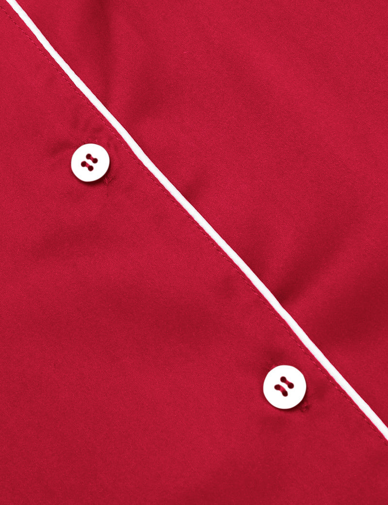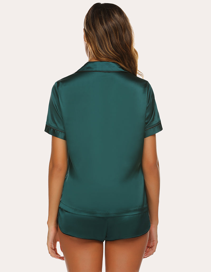 The relaxed fit two-piece comfortable sleepwear pajama set features silky shorts with elastic waistband and matches a silky-smooth short-sleeve V-neck top with a chest pocket, notch collar and the button-front top hits at hips. The sleepwear set are soft and elegant, to giving you a lazy sleep.