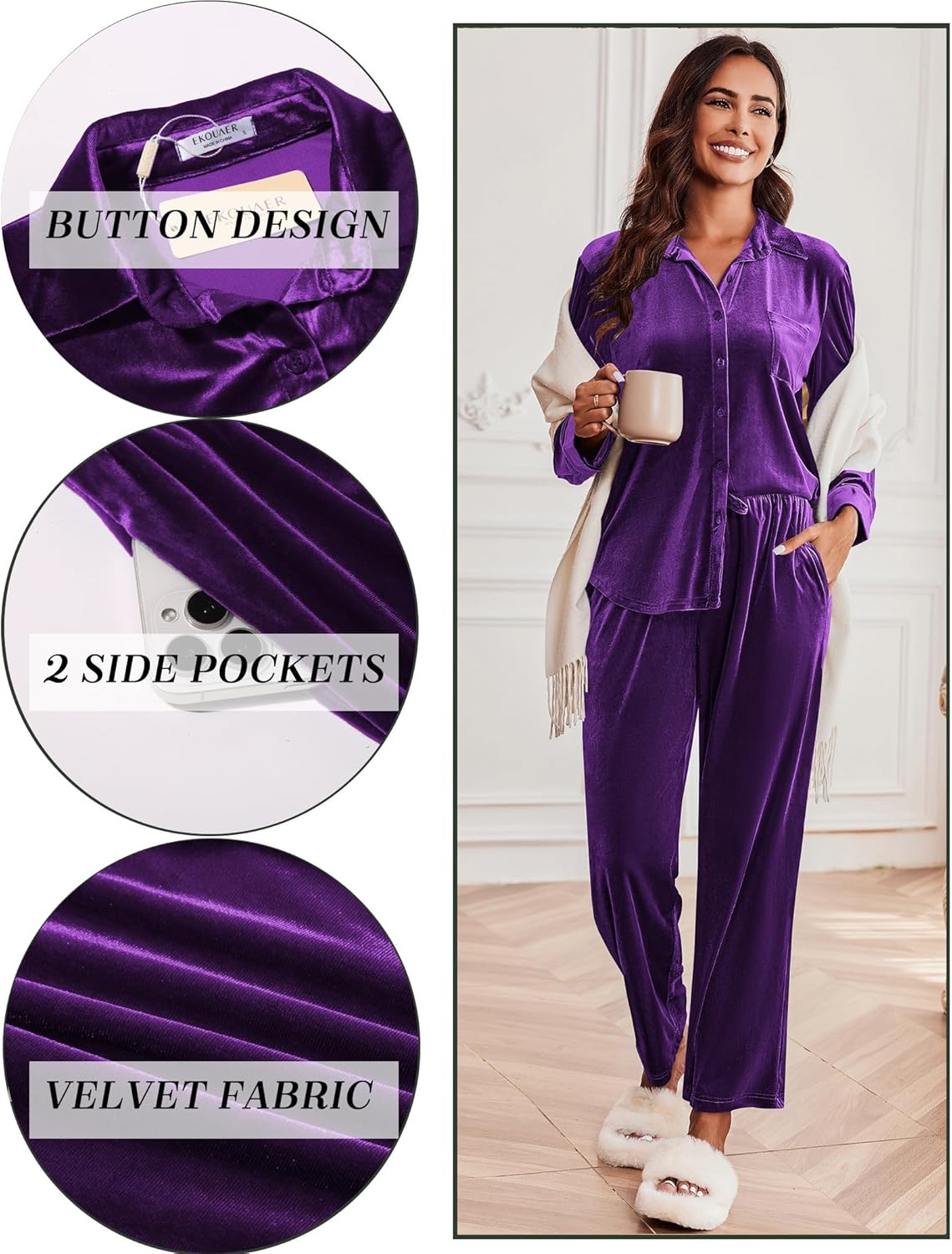 • Features:The women's pajama set includes a long-sleeved button-down top and matching wide-leg pant. The velor Lounge set features soft pajamas with button, elastic waist, handy side pockets, and wide leg pants for a perfect loose fit