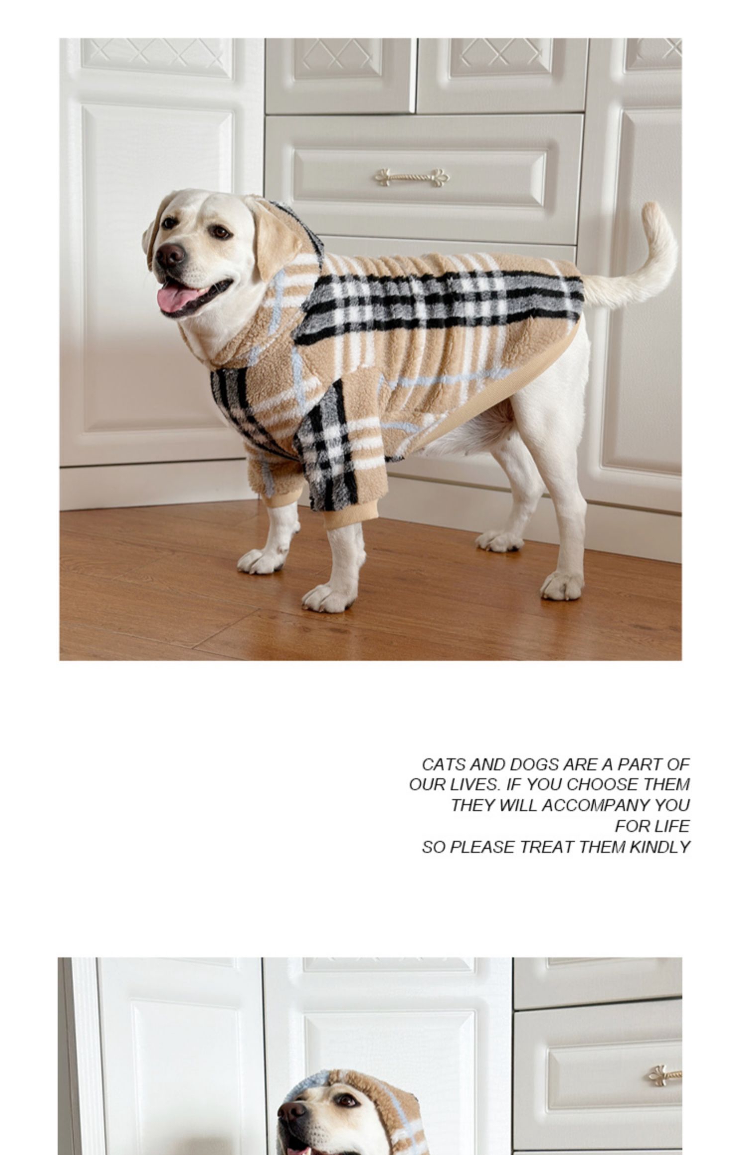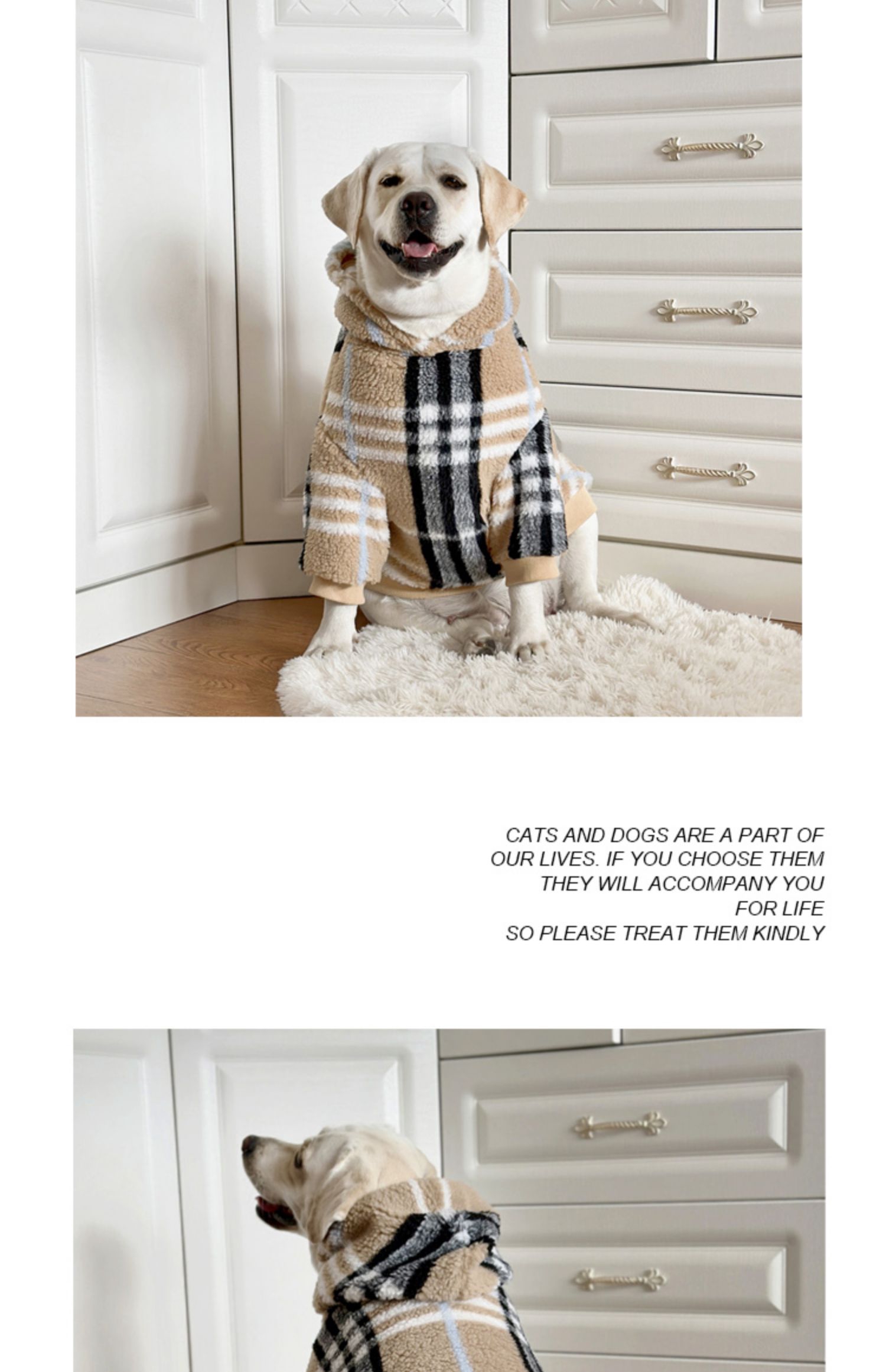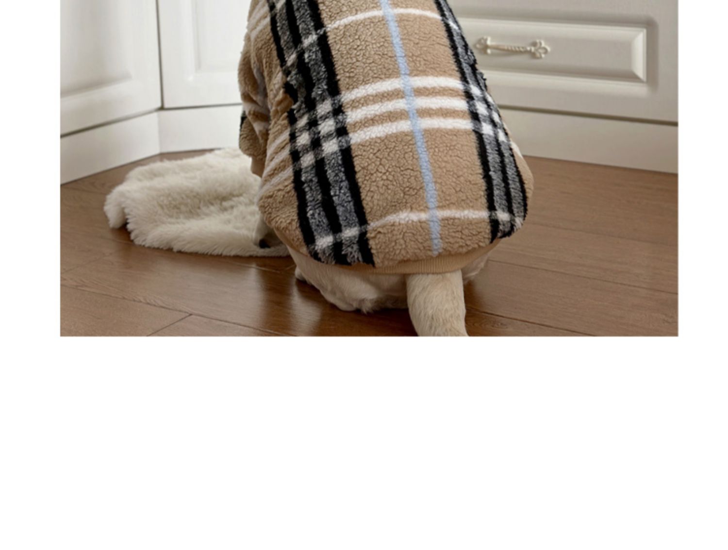 This fashionable lamb wool dog hoodie is perfect for large breeds like Labrador and Golden Retriever. Featuring a classic check pattern, this hoodie keeps your pet warm and stylish during the winter. Ideal for outdoor activities and casual wear.