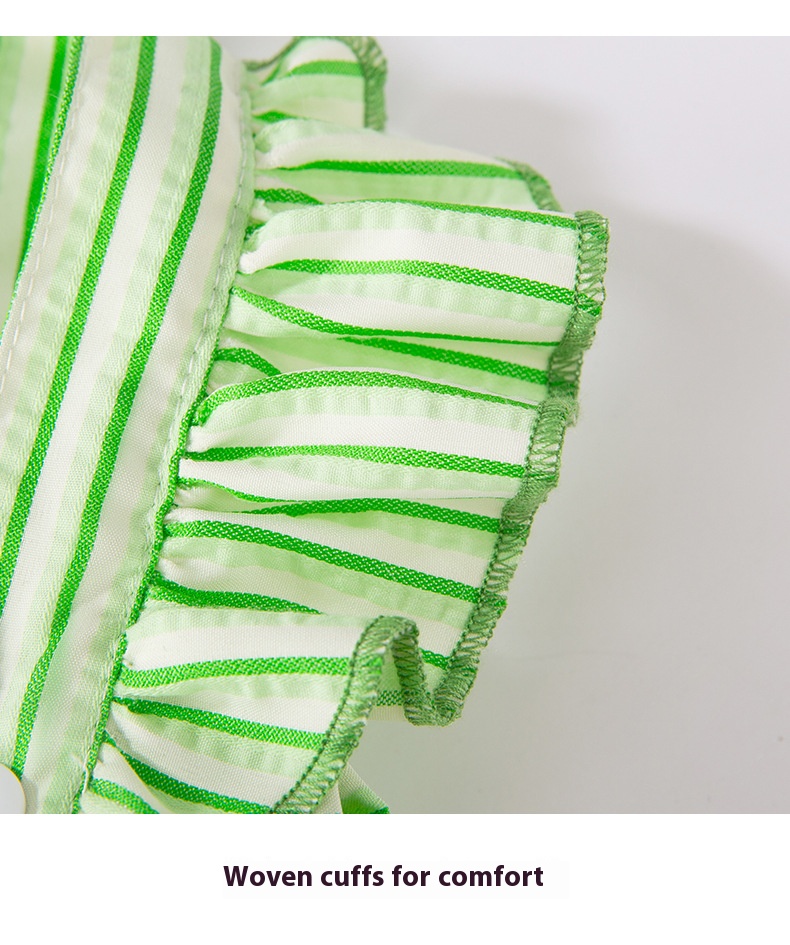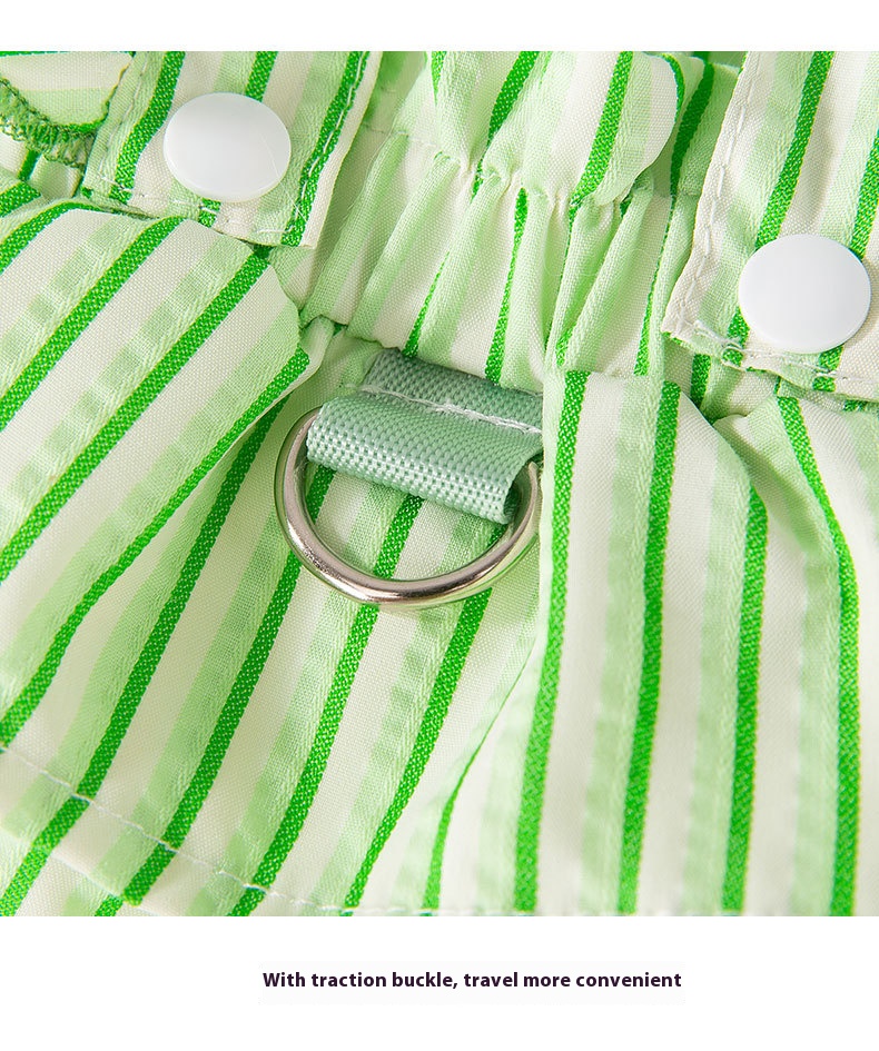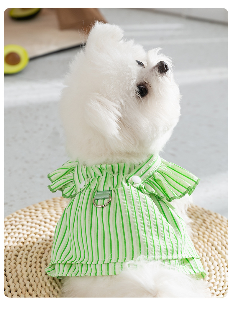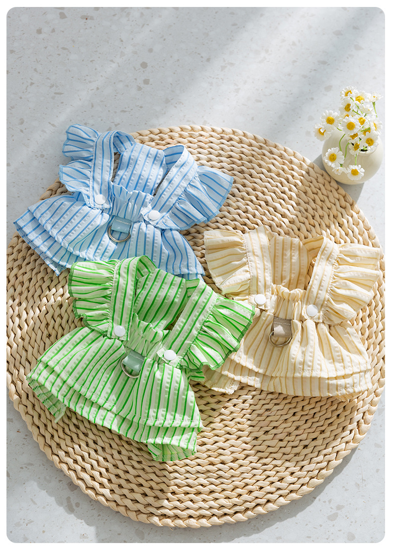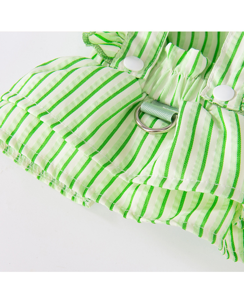 Dress your small dog in style with the LovinPet striped flounced dog dress, perfect for spring and summer outings. This adorable outfit features a vibrant striped pattern and charming flounced sleeves, making it a fashionable choice for any occasion. The dress is designed with a convenient traction buckle, allowing you to easily attach a leash for walks.