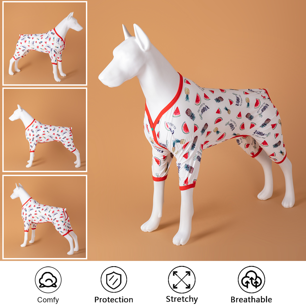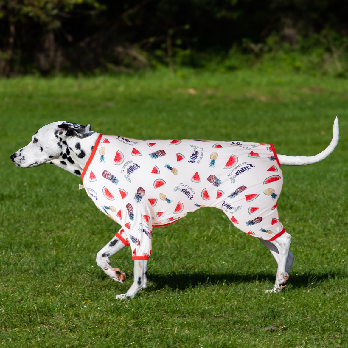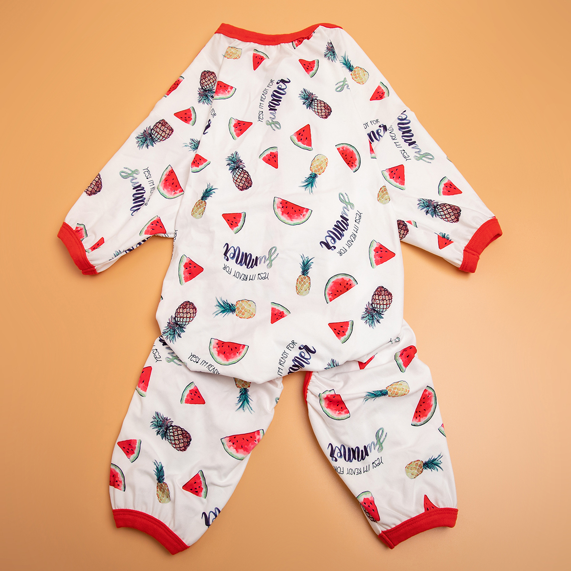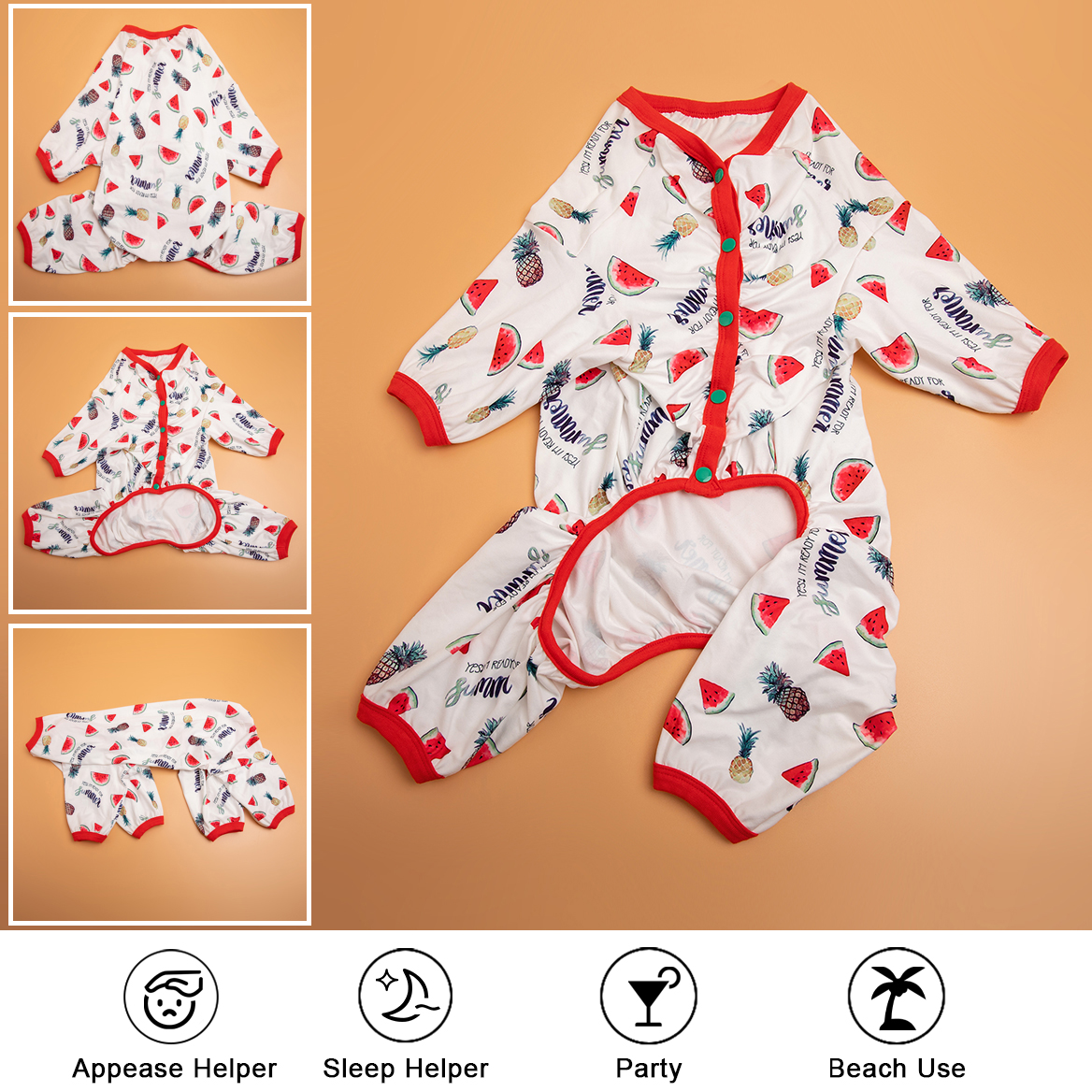 FASHION BUTTIN watermelon/pineapple white ELEMENTS: The dog clothes is a v-neck button with a Watermelon/Pineapple White print design. The button is located on the front of the dog's chest, which will fit the dog's body curve more closely. It is also very chic. It will increase the dog's fashion level.