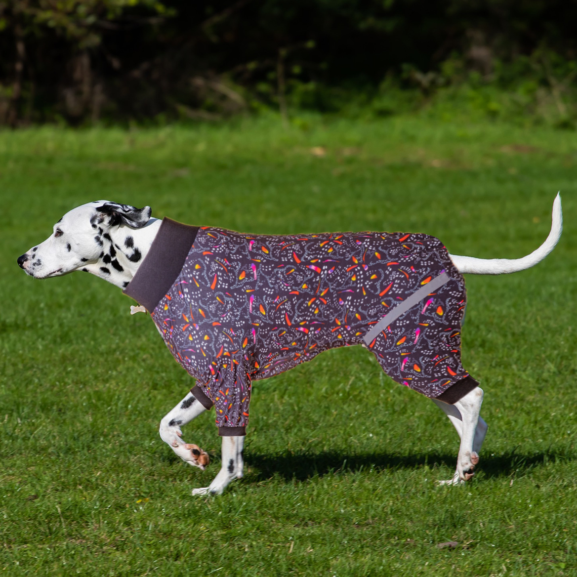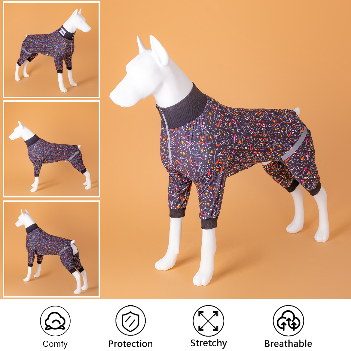 HIGH COLLAR REFLECTIVE BELT DESIGN: This is a high collar neck with a reflective belt migration monarch stripe black prints design, and reflective fabrics are used on the hind legs to make it easy to find your dog when walking at night, the version fits the dog's body curve.
