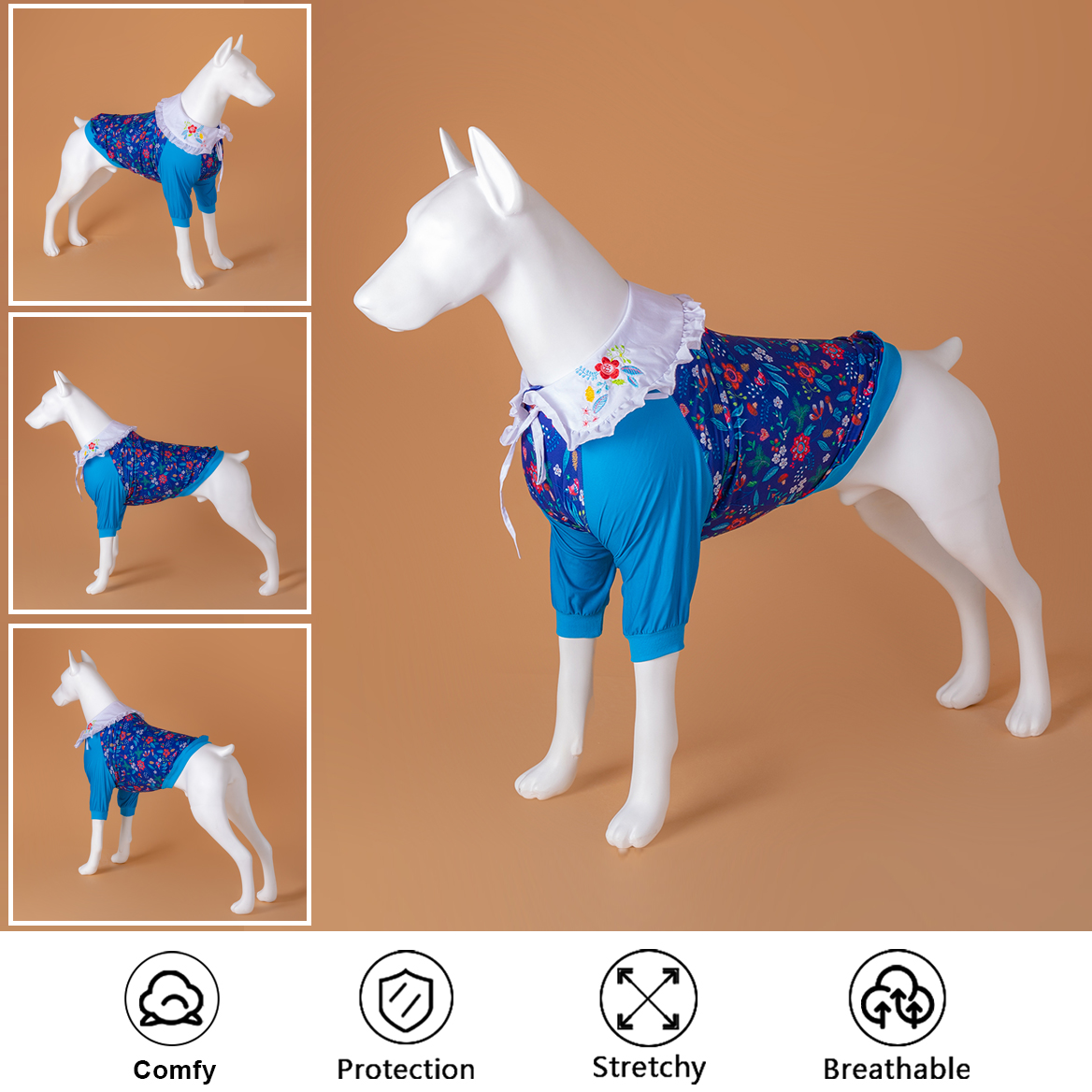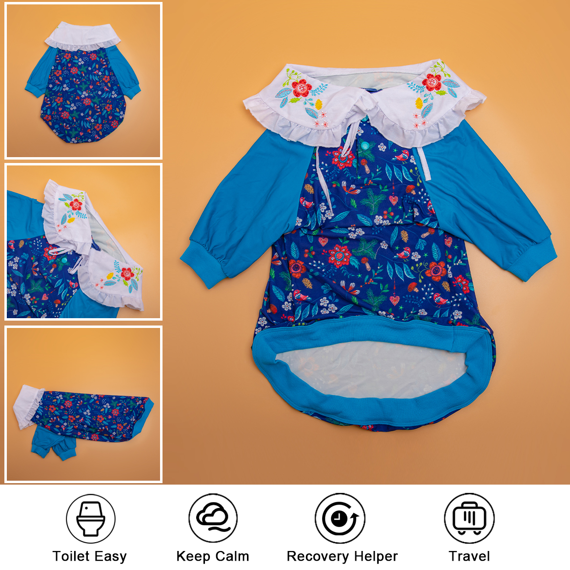 Unique crew neck with two Legged blue stitching multi-flower prints design, Two-leg design will make it easier to put on and take off, and dogs can pee freely without taking off any clothes. The fabric is made by high-quality, dog-friendly materials that are soft and comfortable, warm, but not stifling hot, dogs who like no sense of restraint must like this two-leg design pajamas.