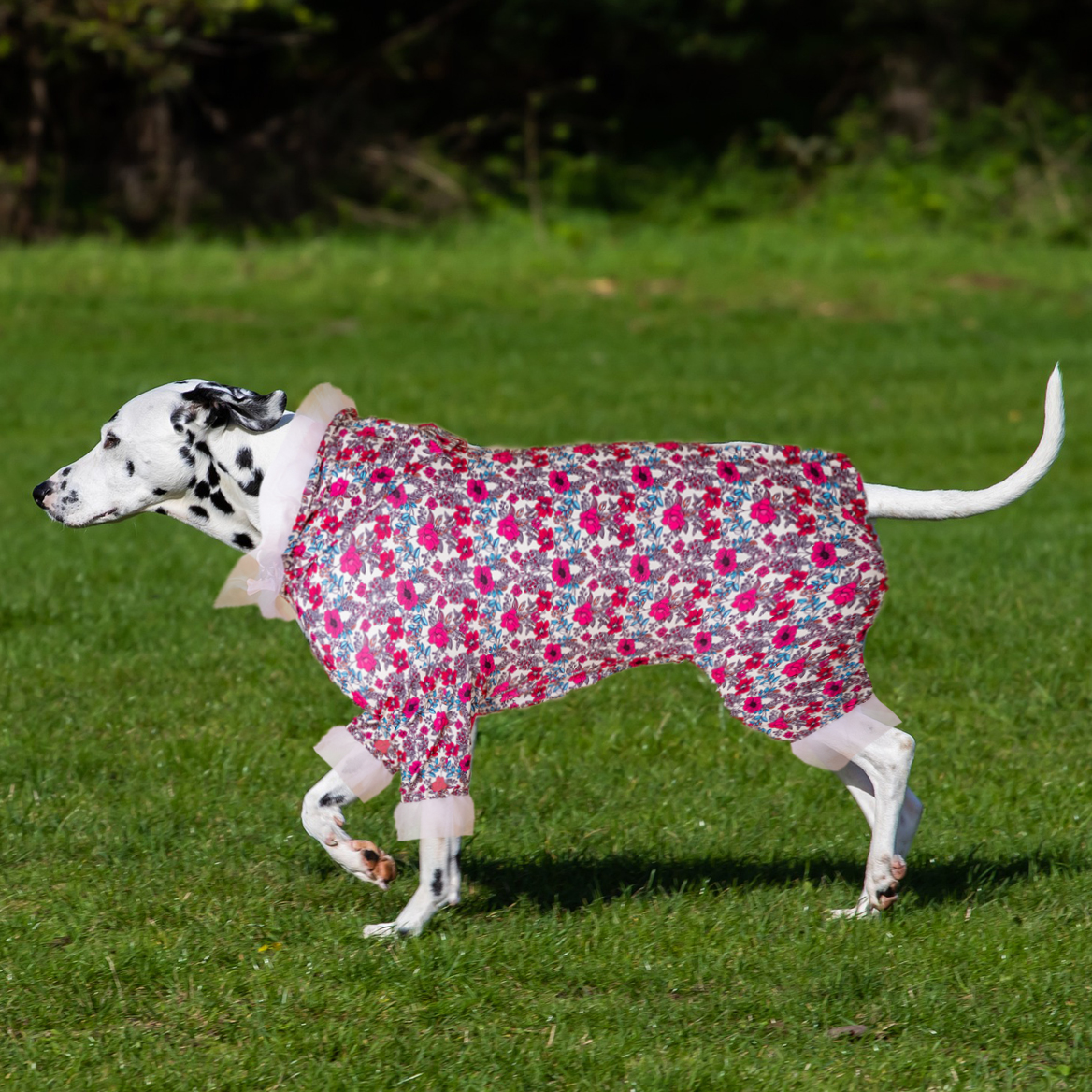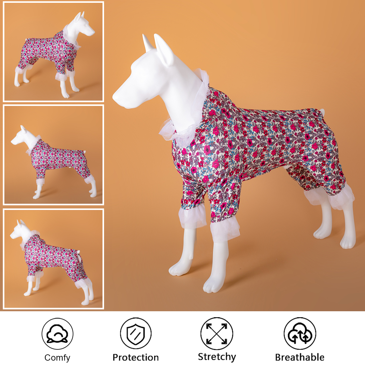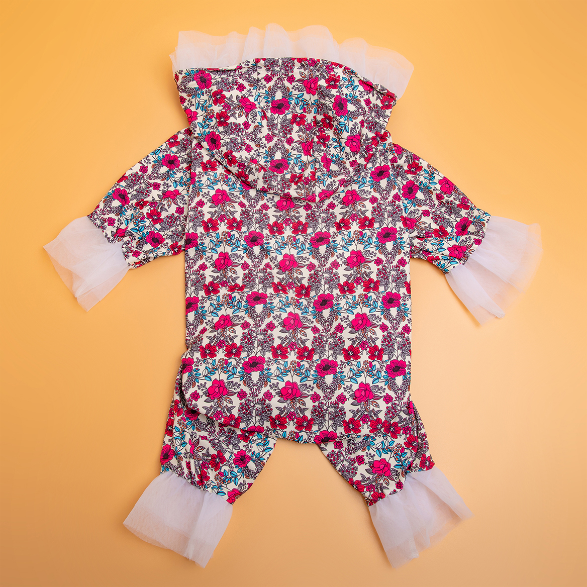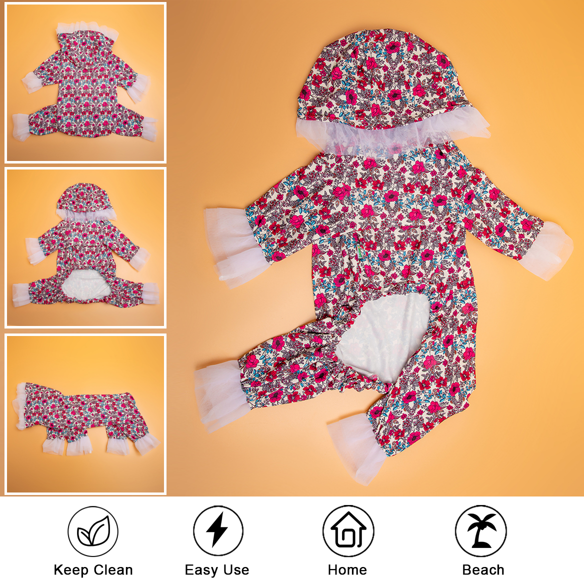 This pjs has a adorable tie hoodie and bright flower group prints design, and the right front leg has a double line design, The hoodie design is windproof, protecting the head of Dog and make the dog look more cute.Anxiety Relief.