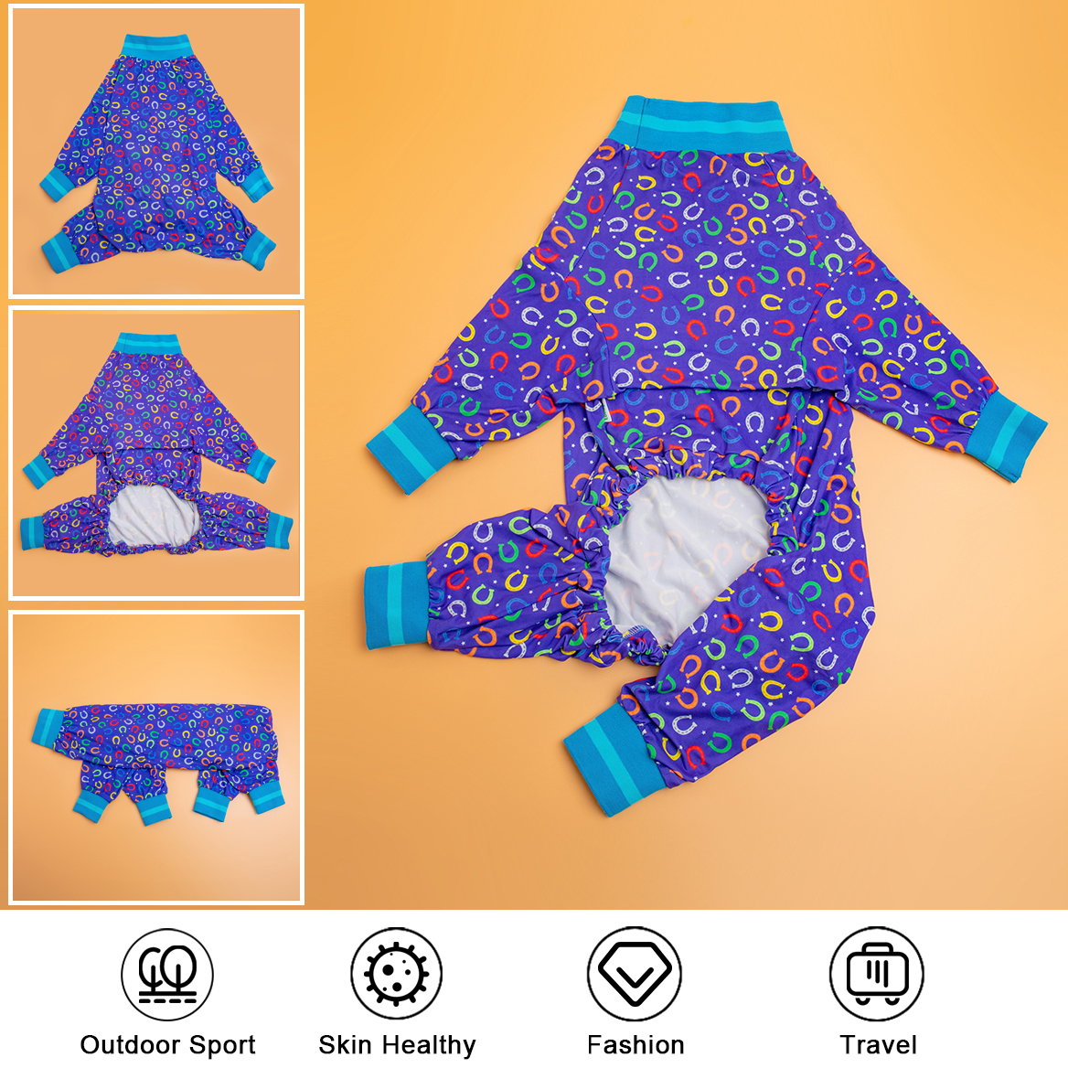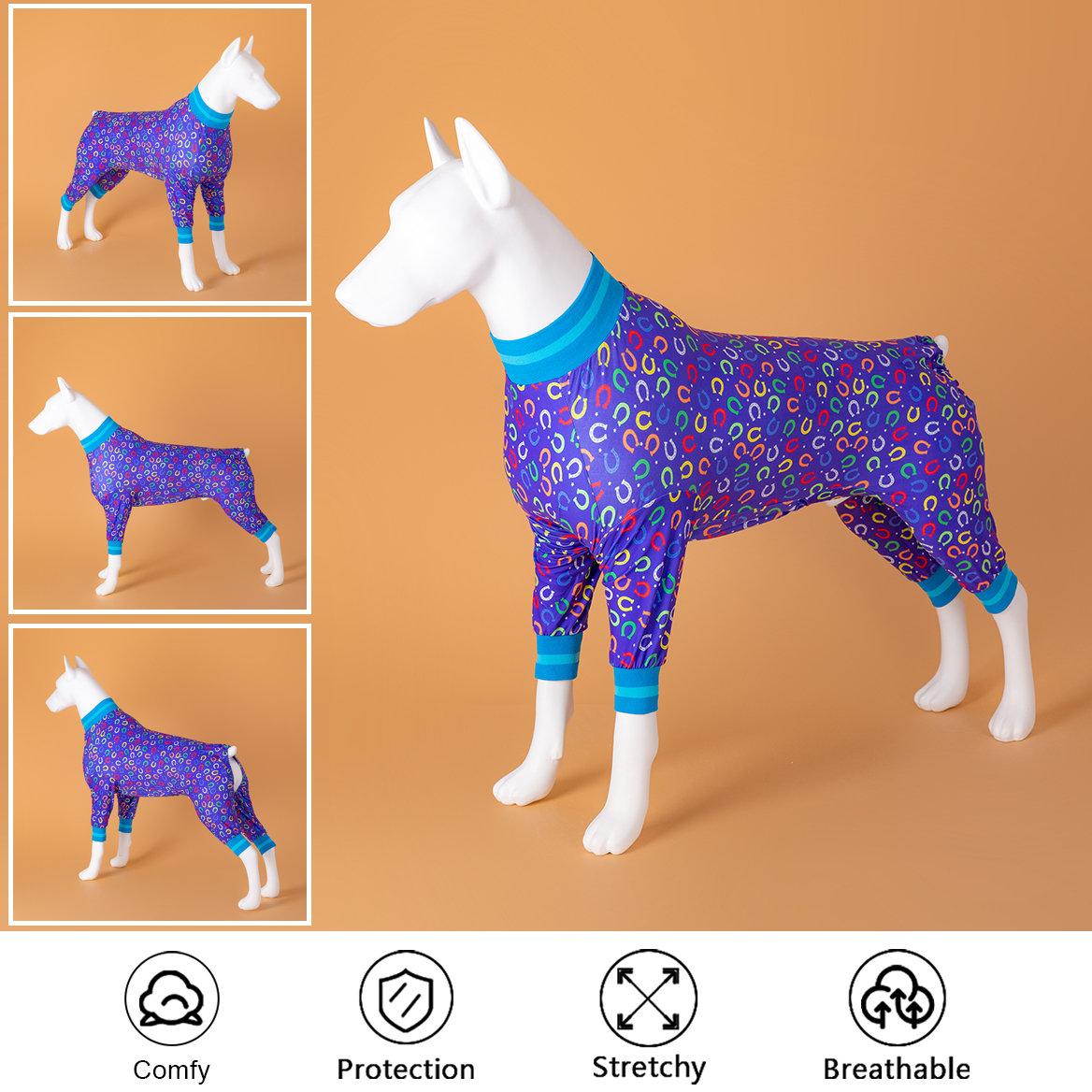 Our dog pajamas for large dogs use double-layer drawstring fabric, soft and comfy / lightweight / high elastic, very easy to put on and take off,  you don't need to worry about fading and deformation after a long-term use.