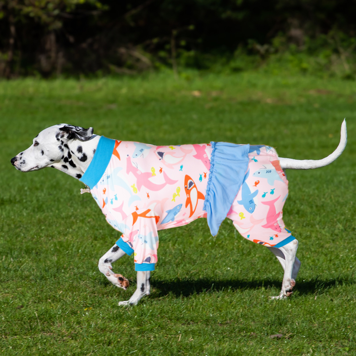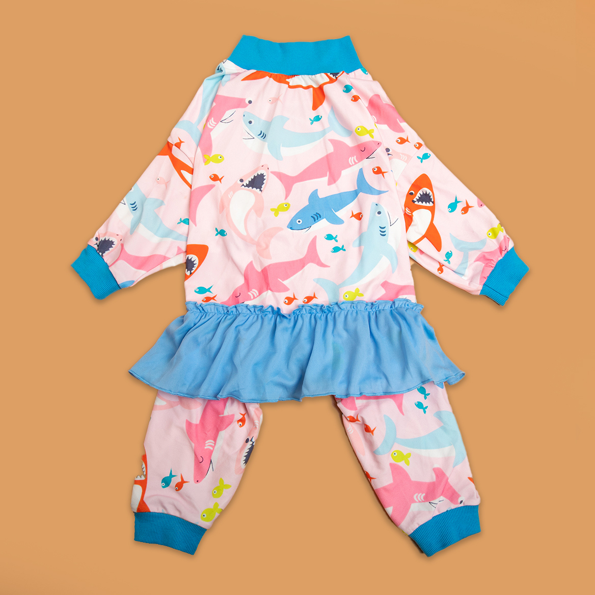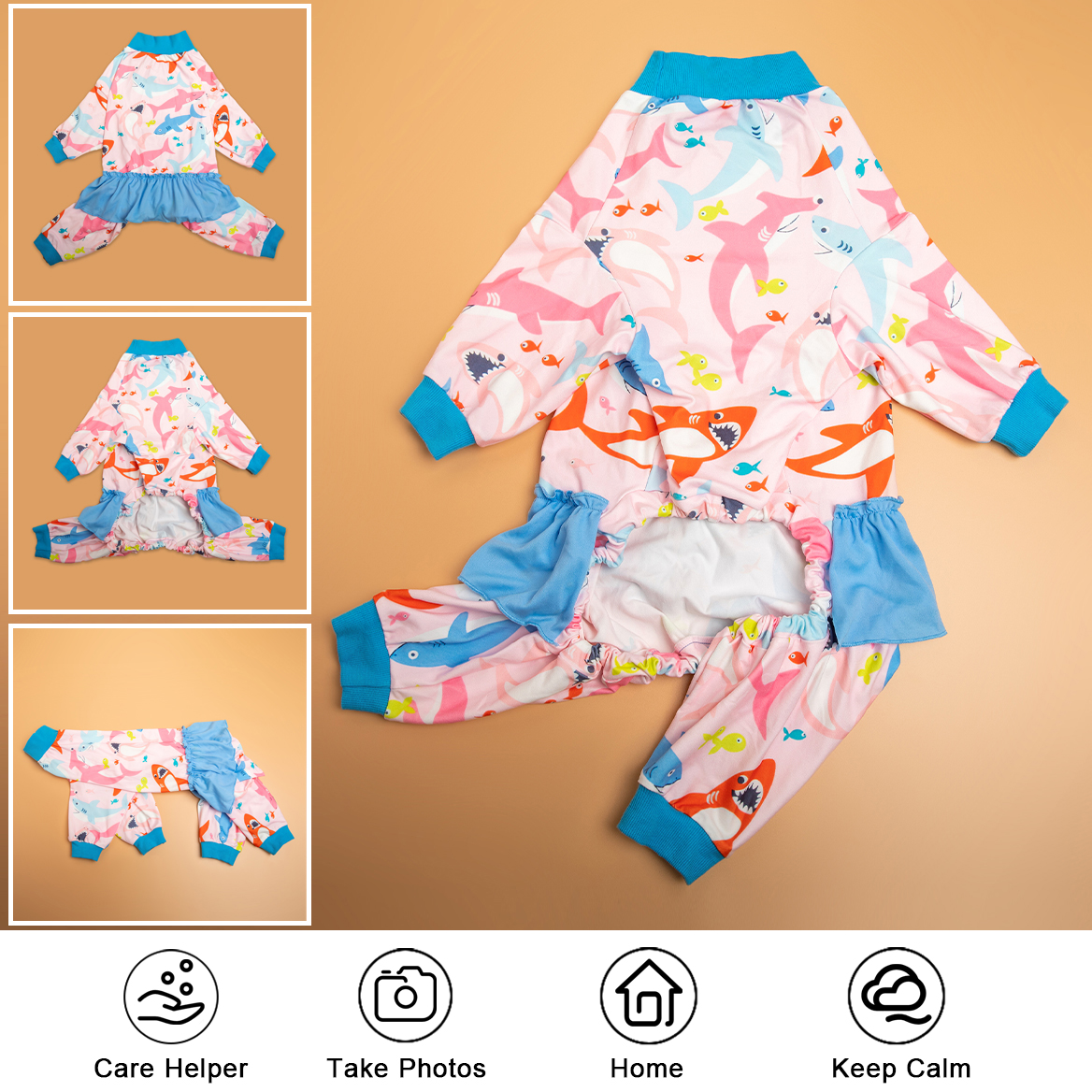 This onesie for dogs after surgery contains high collar neck with big bites pink prints elements, Tand the fabric is made by high-quality, dog-friendly materials that are soft and comfortable, warm, but not stifling hot and do not cause skin discomfort like other Polyester, wool, nylon, denim