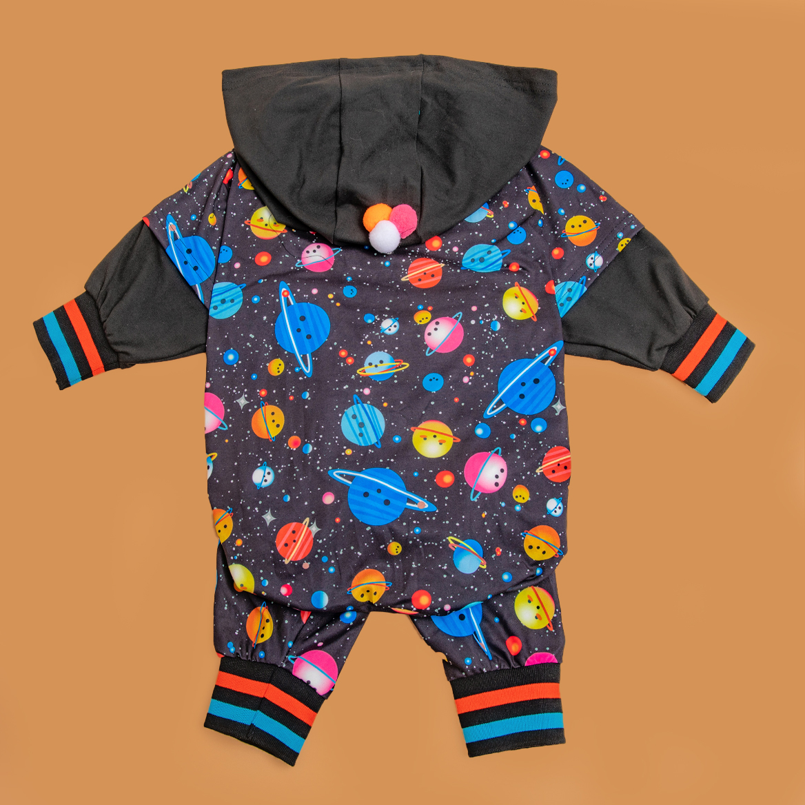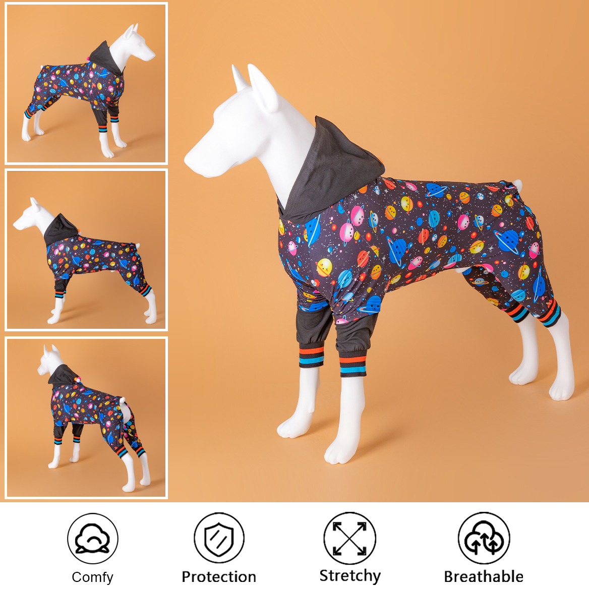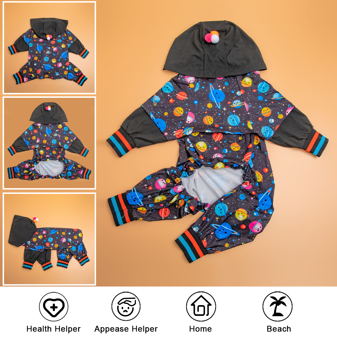 This pjs has a adorable tie hoodie and universe cosmic space black prints design, and the right front leg has a double line design, The hoodie design is windproof, protecting the head of Dog and make the dog look more cute.Anxiety Relief.