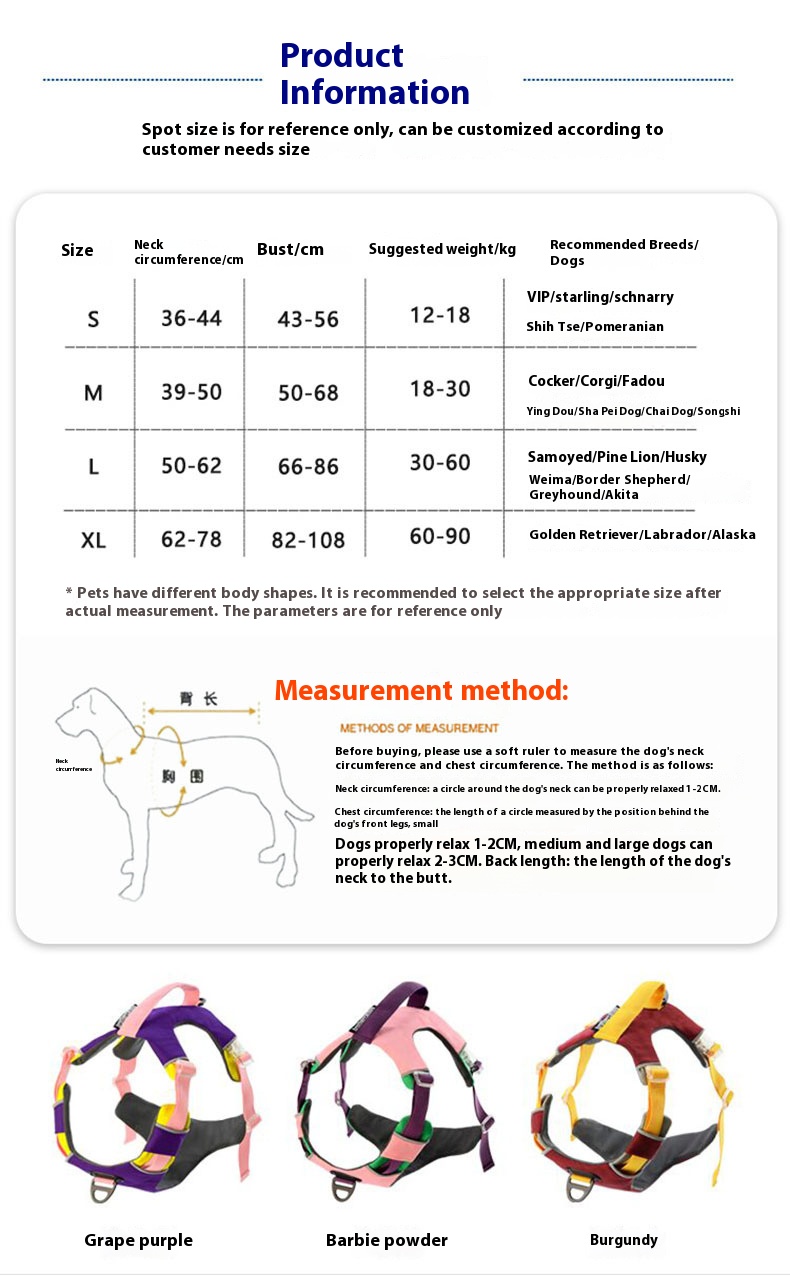 XL: chest circumference 82-108cm scarf 62-78cm recommended 30.00 kg-45.00 kg