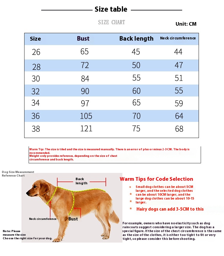 Size 34 (back 65cm chest 97cm suitable for 30.00 kg-39.00 kg
