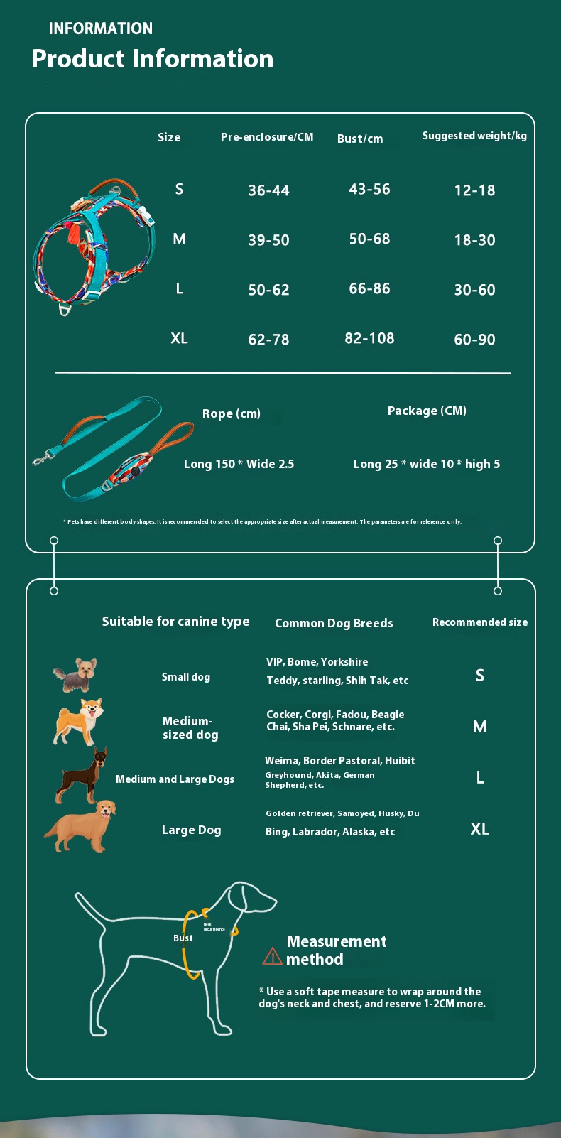 XL (chest circumference 82-108cm scarf 62-78cm recommended 30.00 kg-45.00 kg