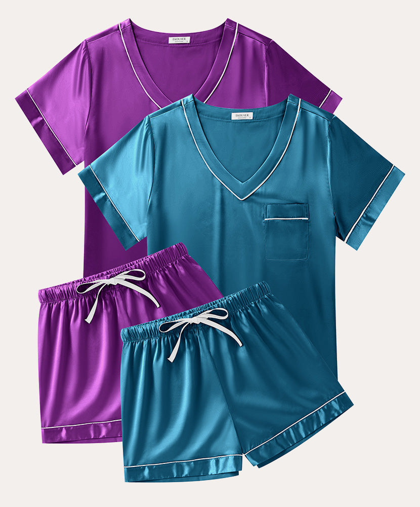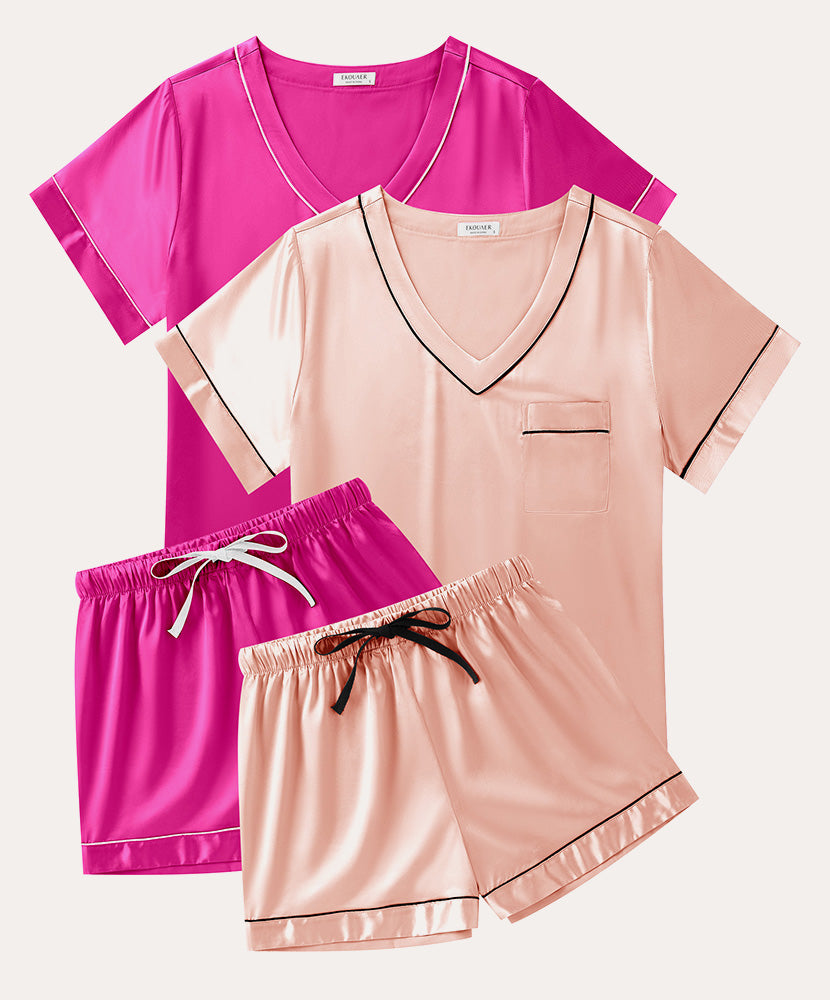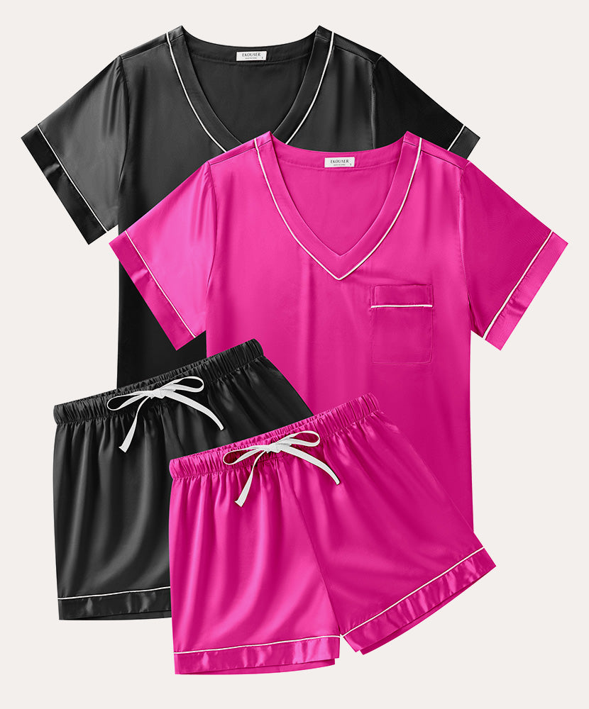 • Design: V-neck, smooth satin top with chest pocket, stretchy elastic waistband
