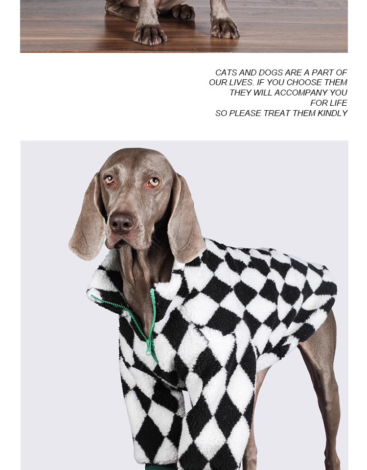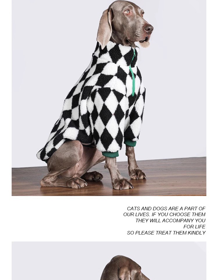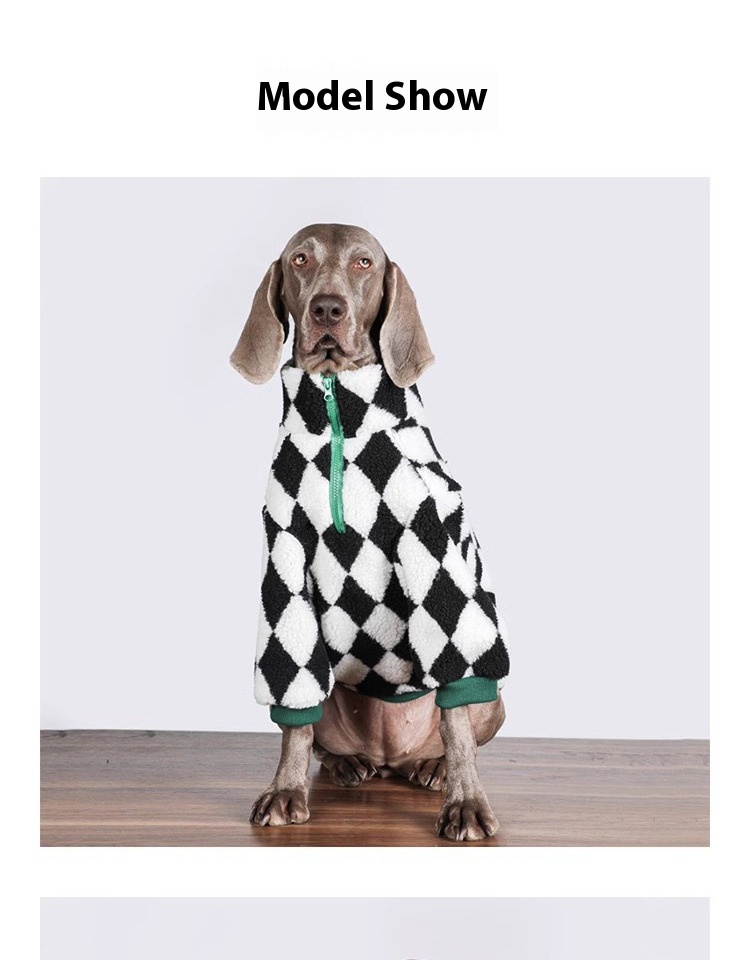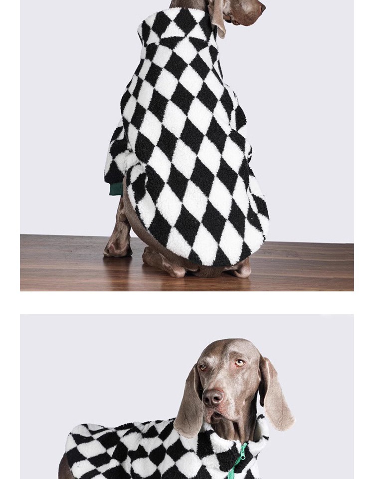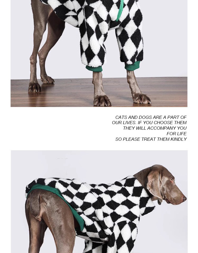 This warm dog hoodie is perfect for large breeds such as Labrador, Golden Retriever, Border Collie, and Samoyed. Featuring a stylish black and white checkered pattern with a convenient zipper, this hoodie ensures your pet stays warm and fashionable during the winter. Ideal for both casual wear and outdoor activities.