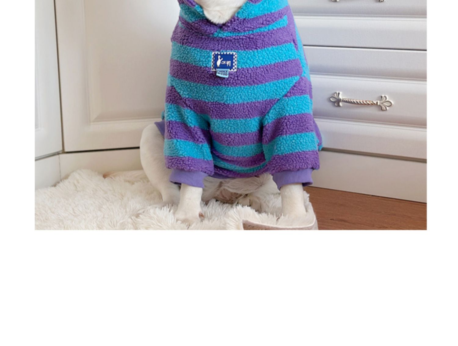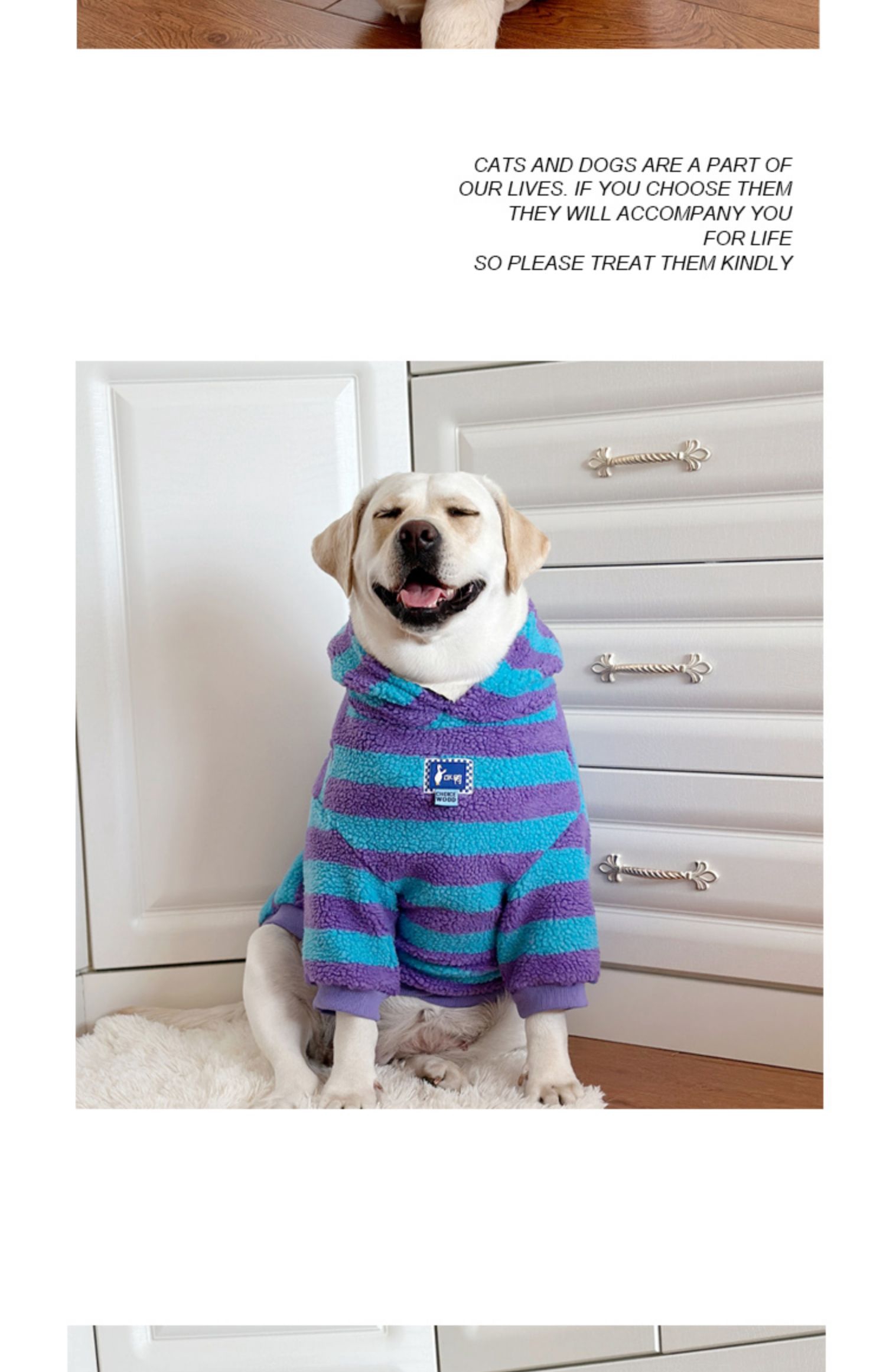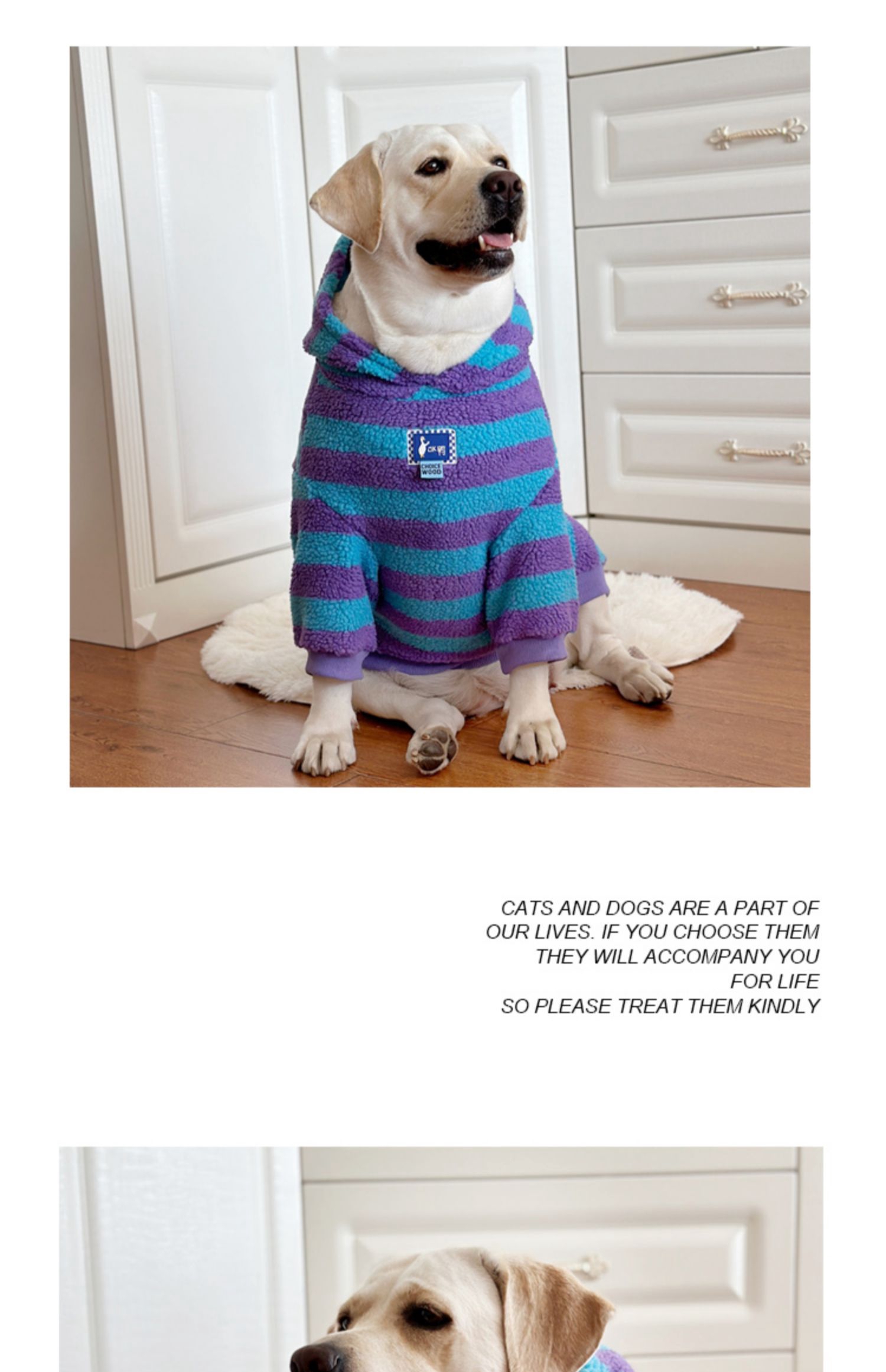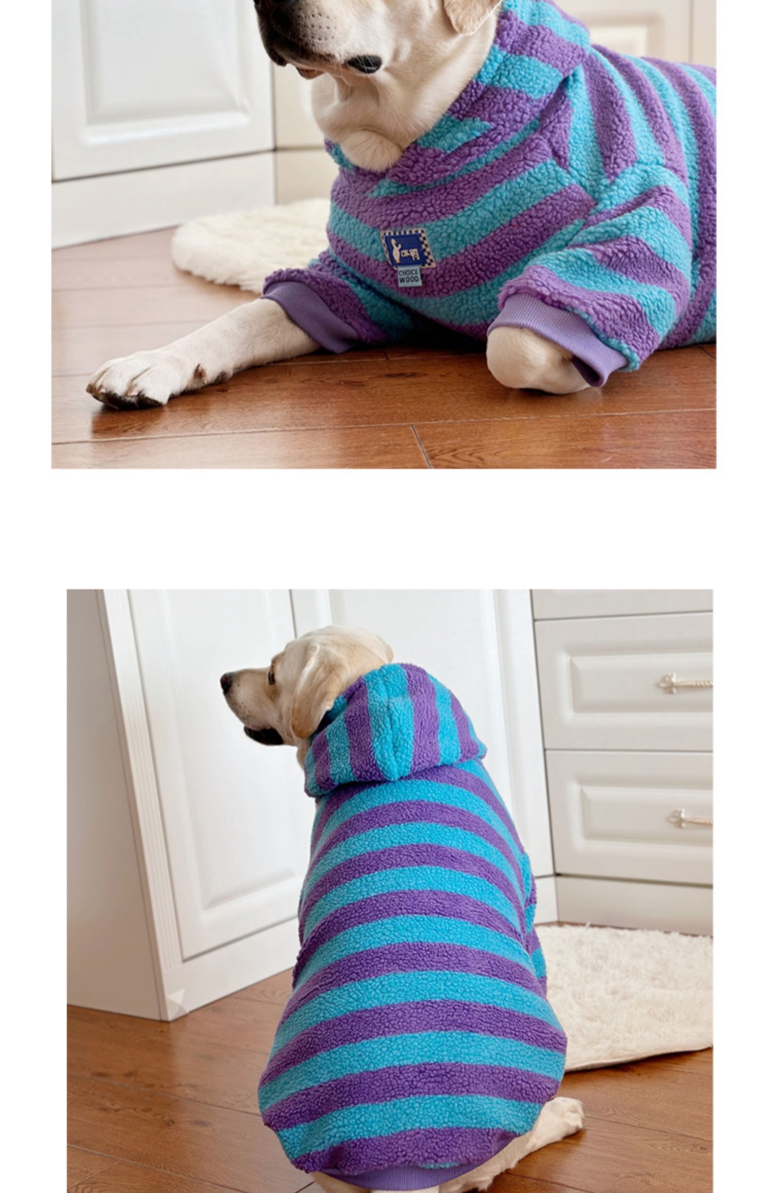 This warm lamb wool dog hoodie is perfect for large breeds like Labrador and Golden Retriever. Featuring a trendy striped design, this hoodie keeps your pet warm and stylish during the winter. Ideal for outdoor activities and casual wear.
