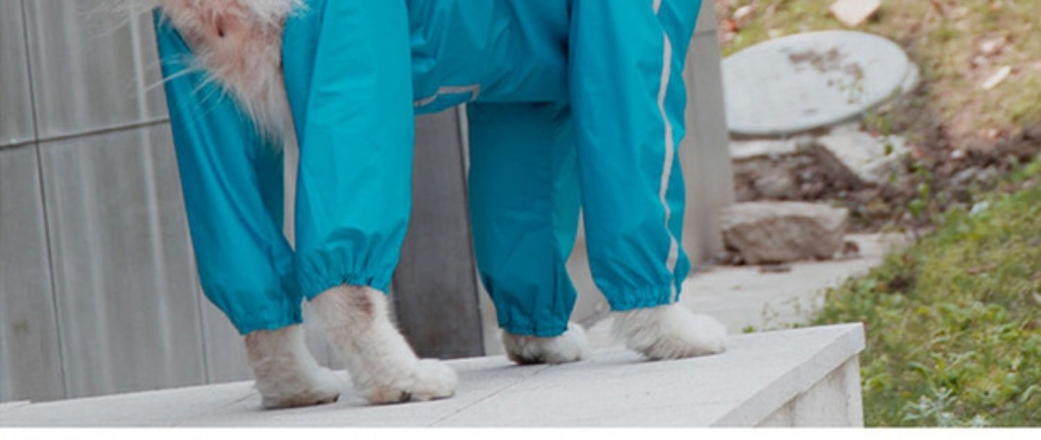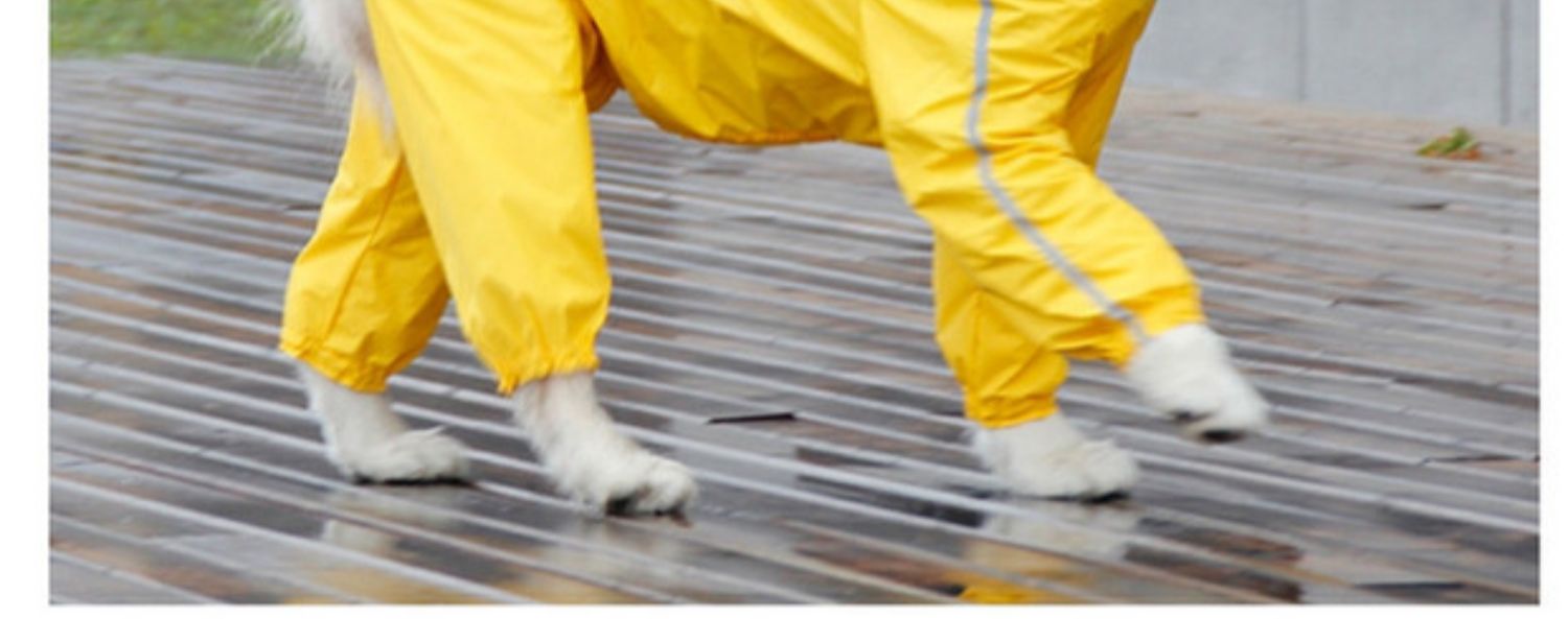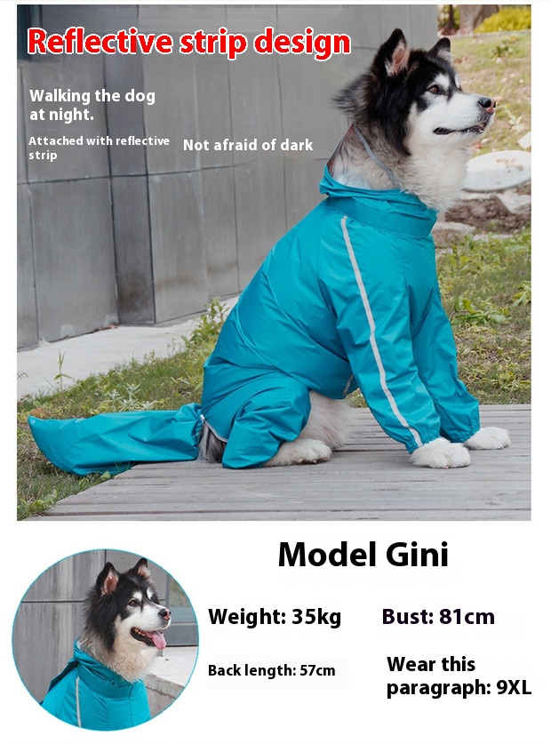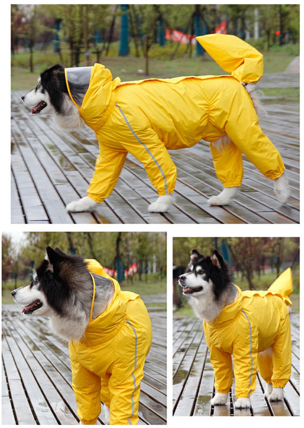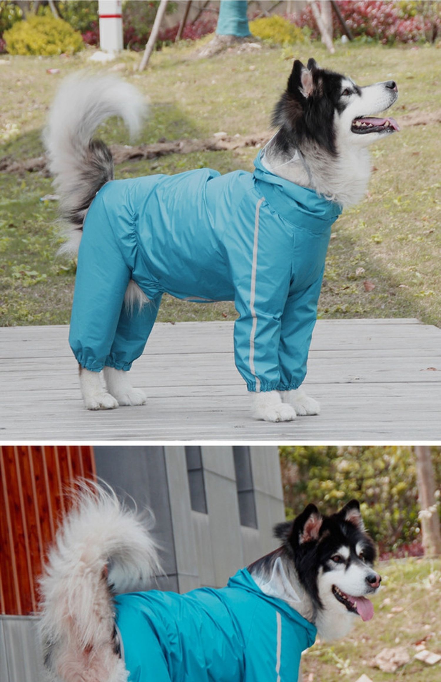 Protect your dog from rain and mud with this full-coverage, waterproof raincoat. Designed for large breeds like Golden Retrievers, Labradors, and Samoyeds, it features a four-legged design, removable tail sleeve, and reflective strips for added safety.